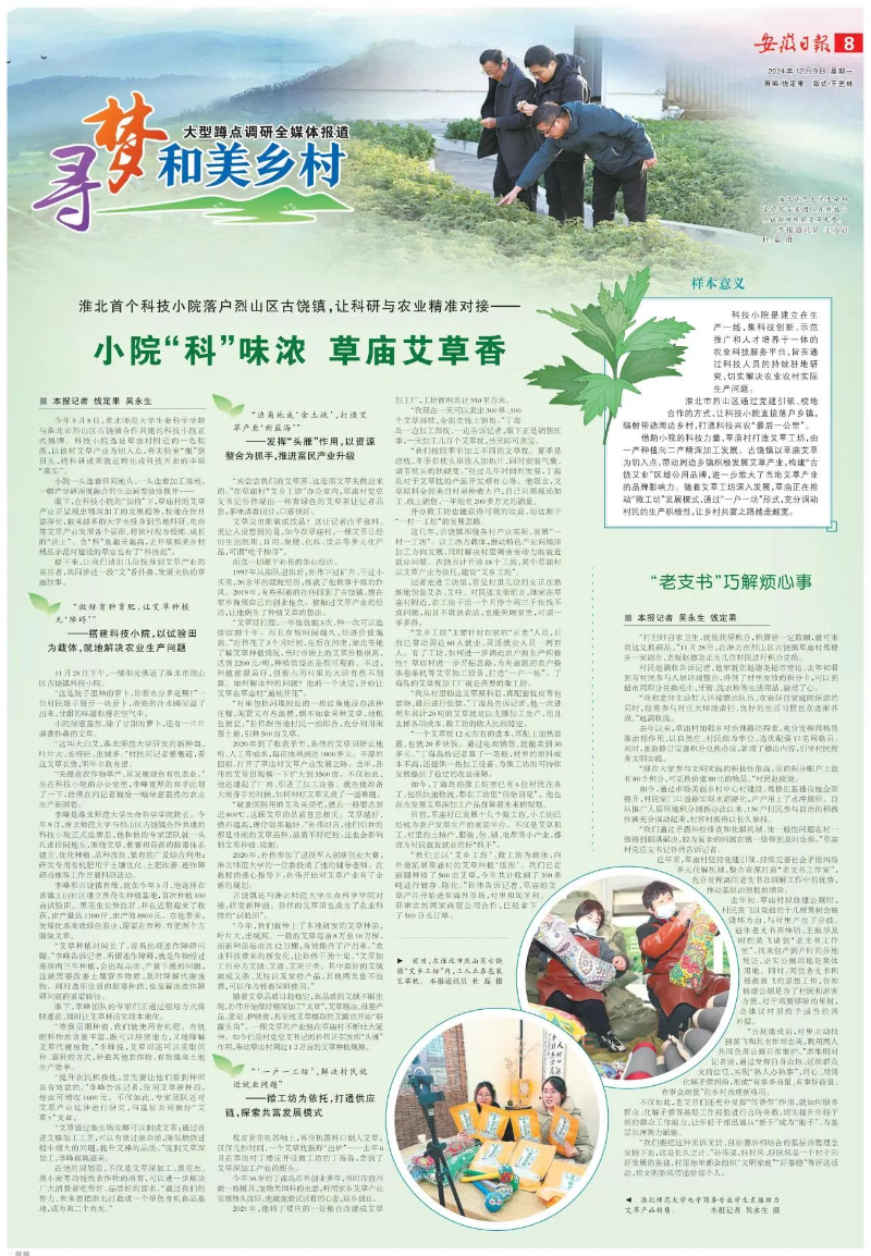 12月9日,《安徽日报》整版报道淮北市烈山区:小院“科”味浓 草庙艾草香。