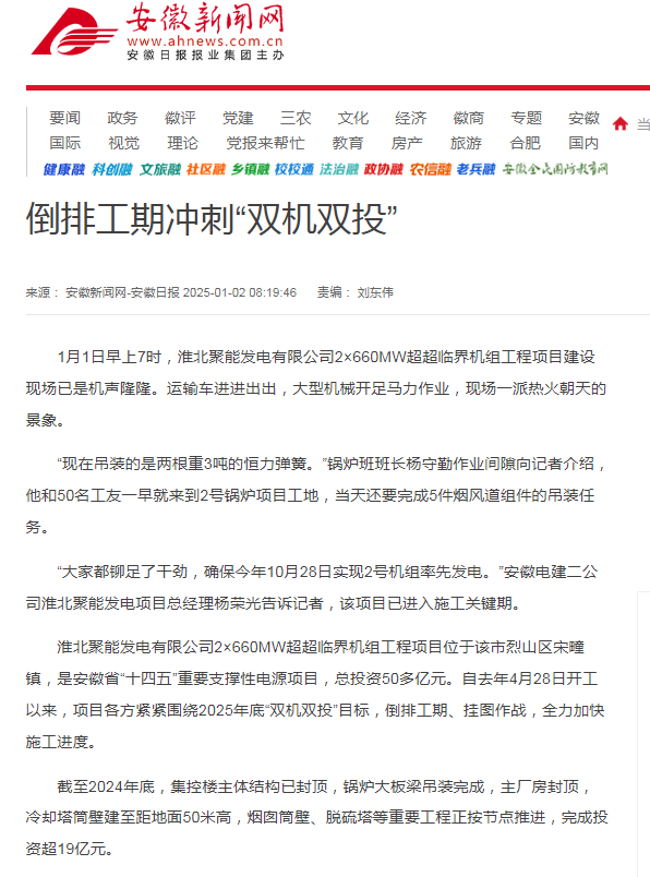淮北聚能发电有限公司2×660MW超超临界机组工程项目位于该市烈山区宋疃镇,是安徽省“十四五”重要支撑性电源项目,总投资50多亿元。自去年4月28日开工以来,项目各方紧紧围绕2025年底“双机双投”目标,倒排工期、挂图作战,全力加快施工进度。