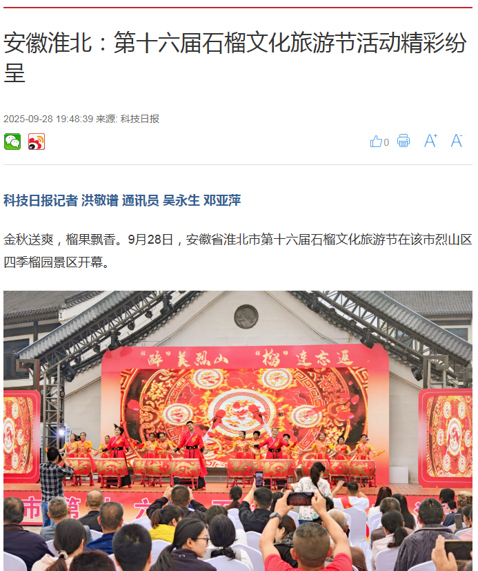2025年9月28日,《科技日报》报道安徽淮北:第十六届石榴文化旅游节活动精彩纷呈。