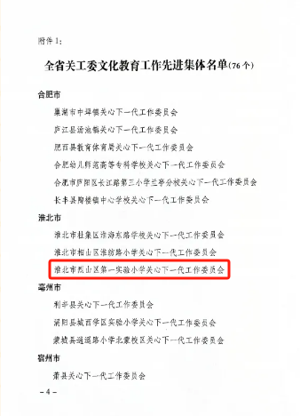 近日,安徽省关心下一代工作委员会印发《关于表彰全省关工委文化教育工作先进集体和先进个人的决定》,淮北市烈山区第一实验小学关心下一代工作委员会榜上有名,荣获“安徽省关工委文化教育工作先进集体”荣誉称号。