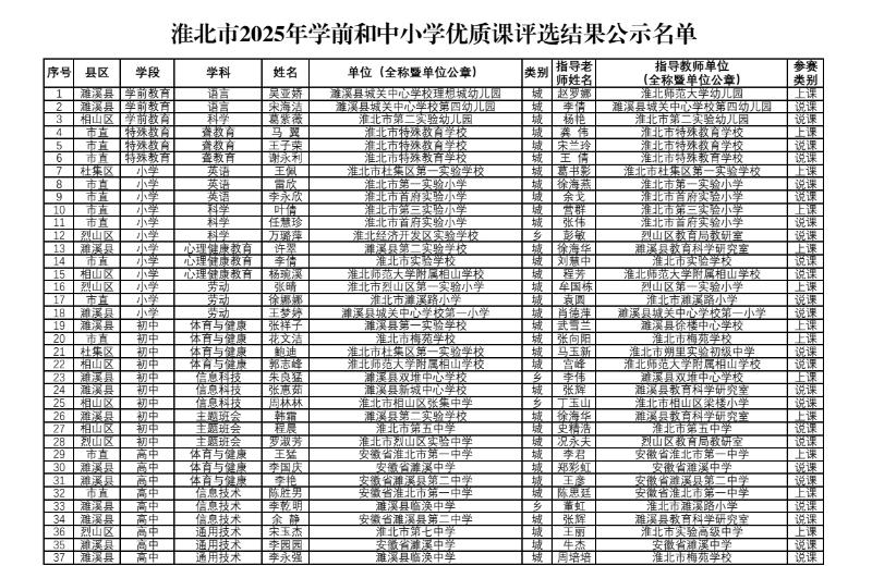 近日,淮北市教育局公布2025年学前和中小学优质课评选结果。淮北七中宋玉杰、烈山区实验中学罗淑芳、烈山区第一实验小学张晴、淮北市经济开发区实验学校万璐萍等4位老师获荐参加安徽省2025年中小学优质课评选活动。