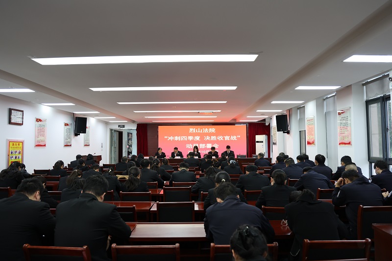 为全面总结前三季度审判执行与重点工作成效,深入剖析当前存在问题,系统部署第四季度攻坚任务,全力打好年度收官之战,10月20日,烈山区法院召开“冲刺四季度 决胜收官战”动员部署会。党组书记、院长赵媛媛出席会议并作讲话,全院干警参会。