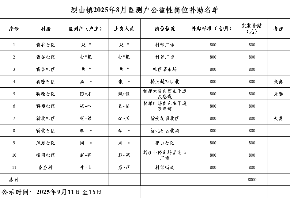 为落实对监测对象的就业帮扶,烈山镇对青谷社区赵郦户赵郦、杜春艳户杜春艳、禹莉户禹莉,蒋疃社区高敬户张倩、陈洪才户魏淑侠、宗召吨户皇爱侠,凤凰社区周玲户周玲、新北社区张思银户李丽芳、李彬户李彬,榴园社区赵成亮户赵成亮,南庄村林宝山户惠桂芹共11人开辟了人居环境保洁员等公益性岗位,由社区负责考核使用。经考核,2025年8月岗位生活补贴对开辟公益性岗位的11人每人应发放800元。经镇党政联席会议讨论通过,同意发放烈山镇监测对象公益性岗位2025年8月一个月岗位生活补贴,共11人,合计应发8800元。名单附后,现予以公示,请广大干部群众监督。