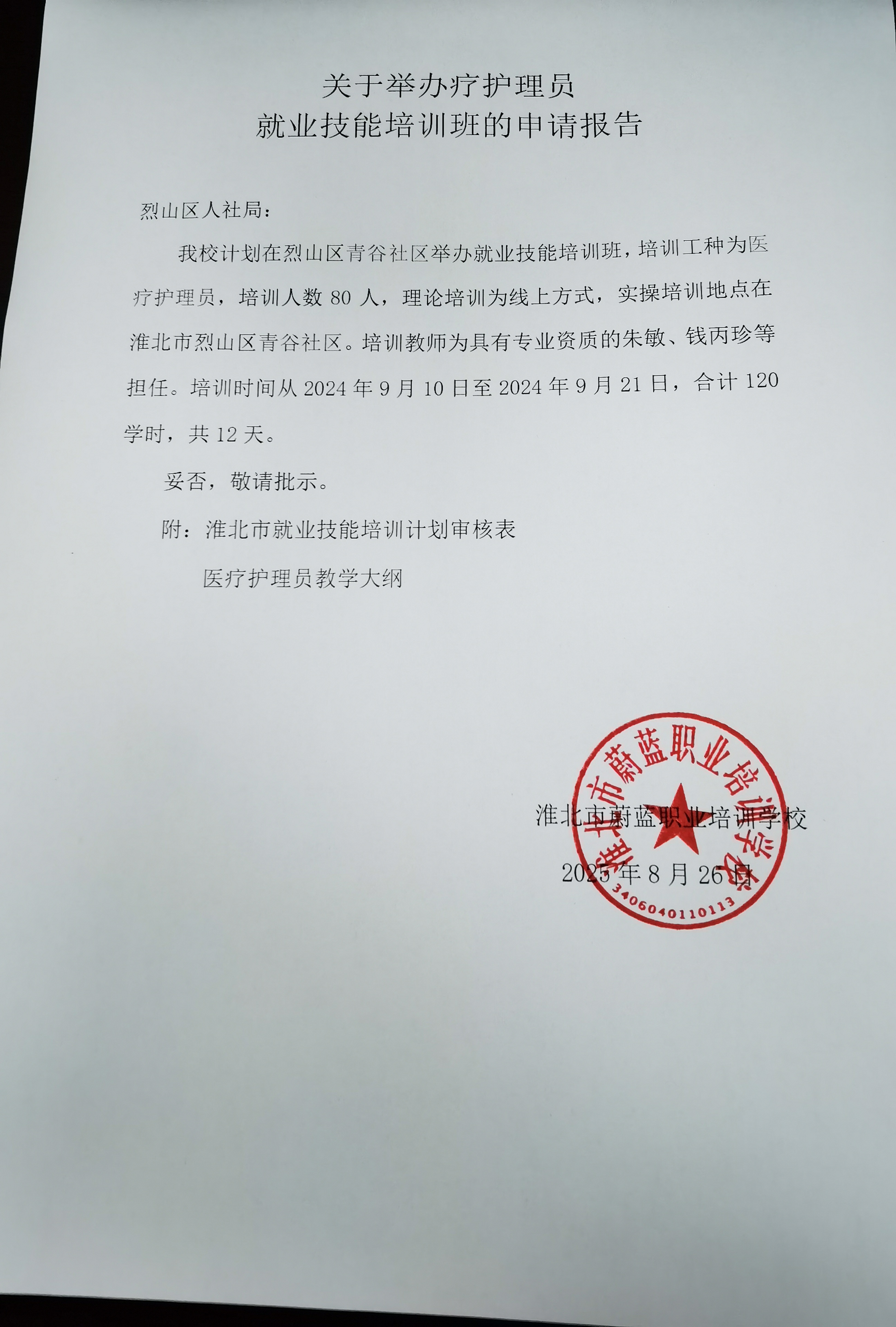 淮北市蔚蓝职业培训学校“2025年度医疗护理员一期”在我辖区开班。培训时间从2025年9月10日至9月21日,培训地点:烈山镇青谷社区,安徽职业培训信息管理系统平台(https://zypx.ahrs.org.cn:9001/ahzypx/login),培训工种:医疗护理员。