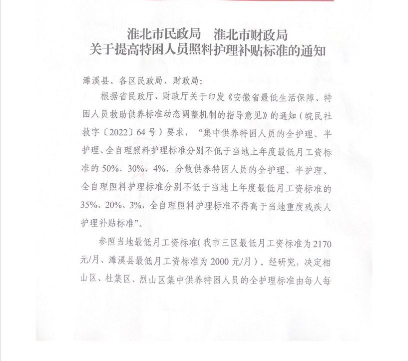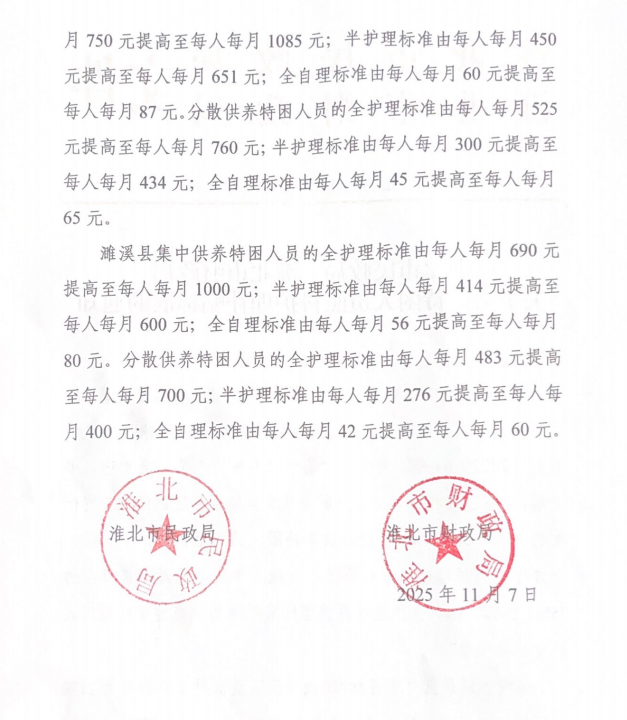 关于提高特困人员照料护理补贴标准的通知(淮民社救〔2025〕4号