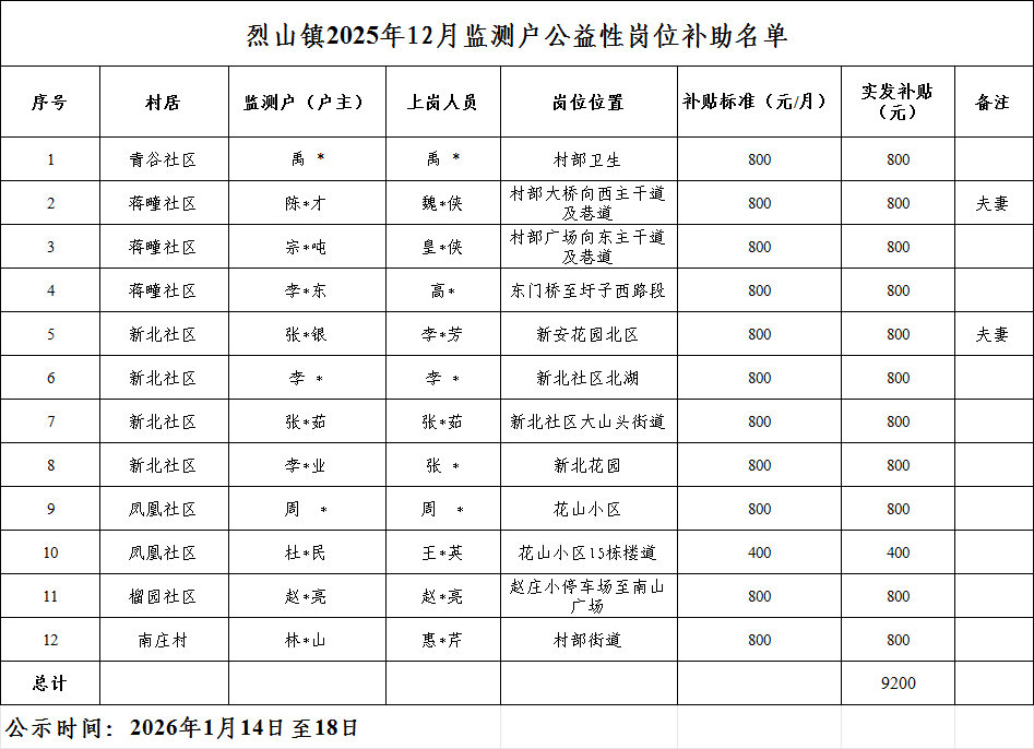 为落实对监测对象的就业帮扶,烈山镇对青谷社区禹莉户禹莉,蒋疃社区陈洪才户魏淑侠、宗召吨户皇爱侠、李存东户高艳,凤凰社区周玲户周玲,新北社区张思银户李丽芳、李彬户李彬、张慧茹户张慧茹、李安业户张燕,榴园社区赵成亮户赵成亮,南庄村林宝山户惠桂芹共11人开辟了人居环境保洁员等公益性岗位,对凤凰社区杜士民户王兰英1人开辟了人居环境保洁员等公益性辅岗,由社区负责考核使用。经考核,2025年12月岗位生活补贴对开辟公益性岗位的11人每人应发放800元,对开辟公益性辅岗的1人每人应发放400元。经镇党政联席会议讨论通过,同意发放烈山镇监测对象公益性岗位2025年12月一个月岗位生活补贴,共12人,合计应发9200元。名单附后,现予以公示,请广大干部群众监督。