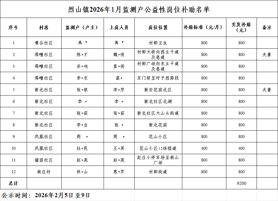 为落实对监测对象的就业帮扶,烈山镇对青谷社区禹莉户禹莉,蒋疃社区陈洪才户魏淑侠、宗召吨户皇爱侠、李存东户高艳,凤凰社区周玲户周玲,新北社区张思银户李丽芳、李彬户李彬、张慧茹户张慧茹、李安业户张燕,榴园社区赵成亮户赵成亮,南庄村林宝山户惠桂芹共11人开辟了人居环境保洁员等公益性岗位,对凤凰社区杜士民户王兰英1人开辟了人居环境保洁员等公益性辅岗,由社区负责考核使用。经考核,2026年1月岗位生活补贴对开辟公益性岗位的11人每人应发放800元,对开辟公益性辅岗的1人每人应发放400元。经镇党政联席会议讨论通过,同意发放烈山镇监测对象公益性岗位2026年1月一个月岗位生活补贴,共12人,合计应发9200元。名单附后,现予以公示,请广大干部群众监督。