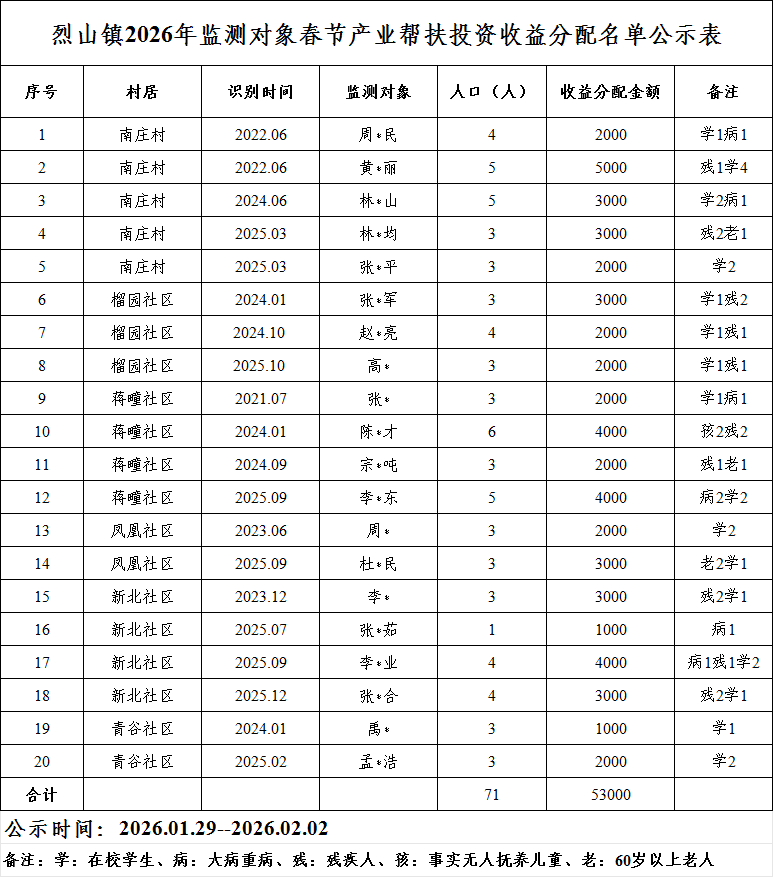 烈山镇2026年监测对象春节产业帮扶投资收益分配名单公示