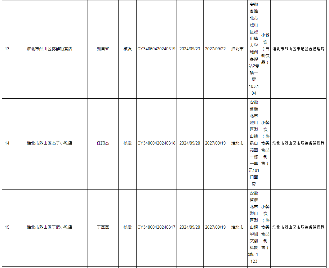 2024年9月烈山区市场监督管理局小餐饮、食品摊贩备案基本信息统计表