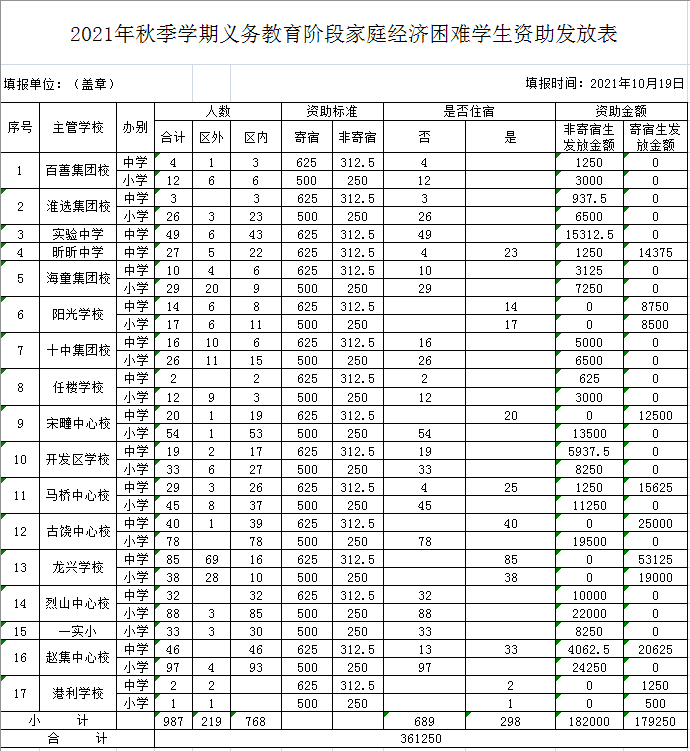 2021年秋季学期义务教育学生国家资助汇总