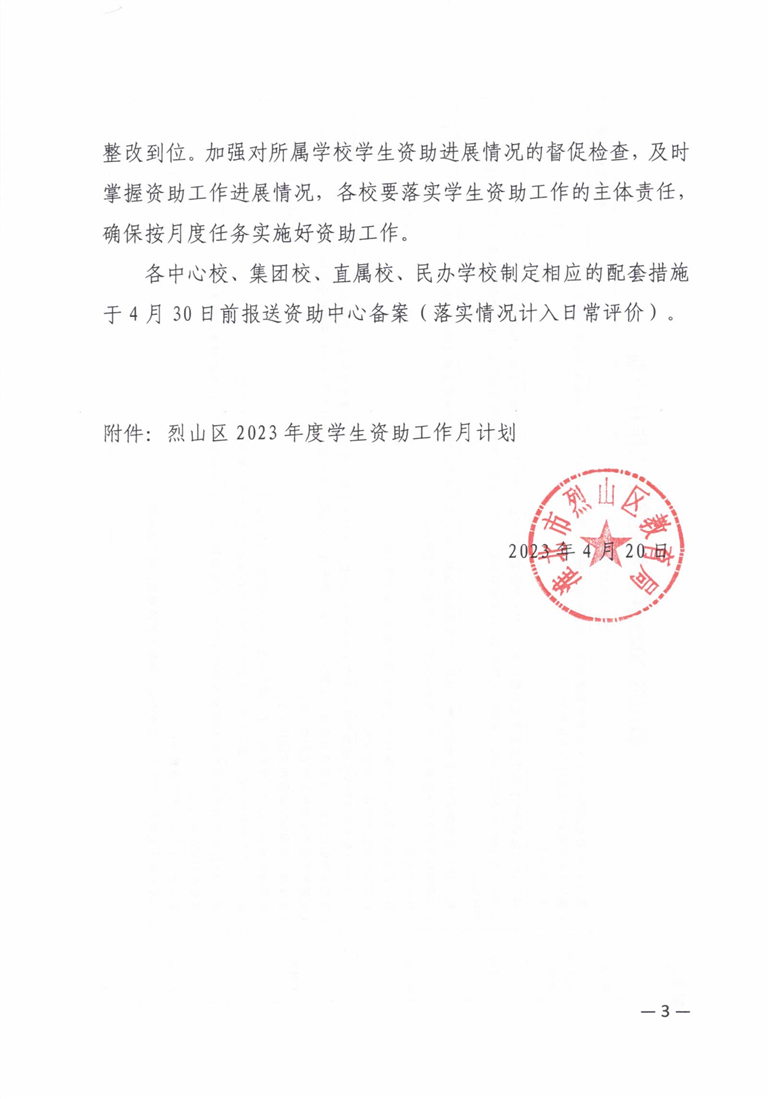 关于下达烈山区2023年度学生资助月度工作计划的通知