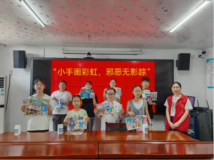 活动现场气氛热烈,孩子们兴致勃勃地拿起五彩画笔,在画纸上尽情挥洒想象力。有的作品描绘正义英雄战胜邪恶的画面,有的通过明亮色彩和生动形象传递拒绝邪教、拥抱美好生活的心声。每一幅画作都充满童真与创意,展现出孩子们纯洁的心灵和丰富的想象力。