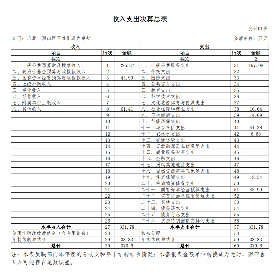 淮北市烈山区百善街道办2024年收入支出决算总表