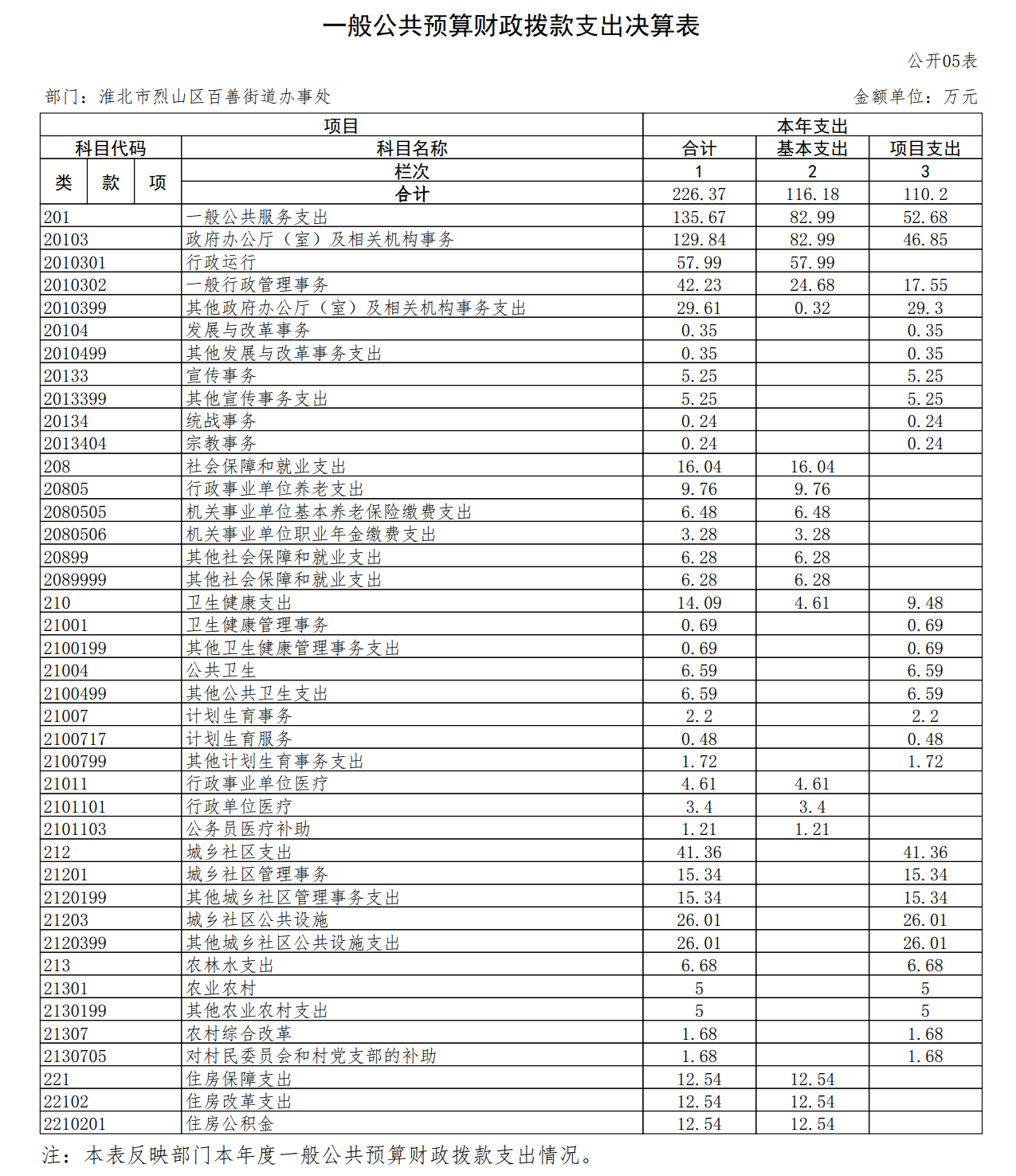 淮北市烈山区百善街道办事处财政拨款2024年一般公共预算财政拨款支出预算表