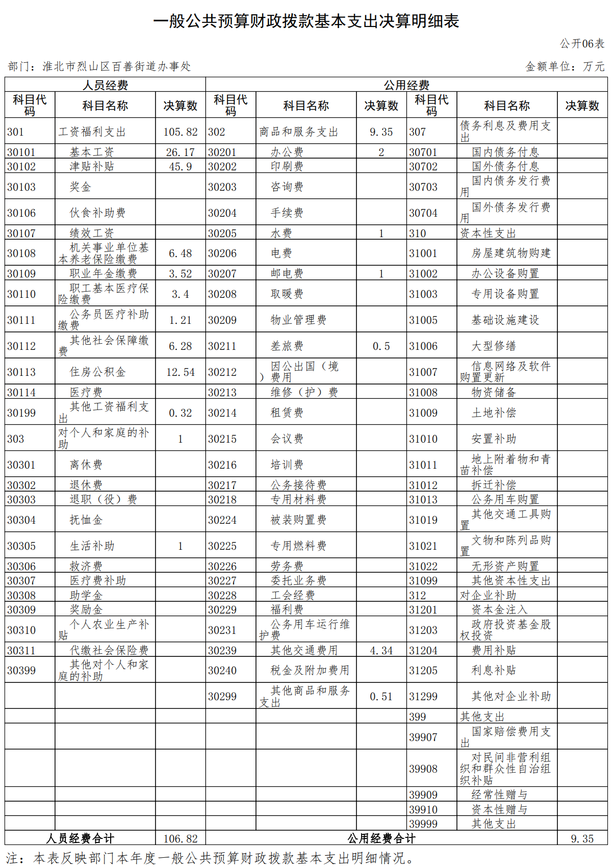 淮北市烈山区百善街道办事处财政拨款2024年一般公共预算财政款基本支出明细表
