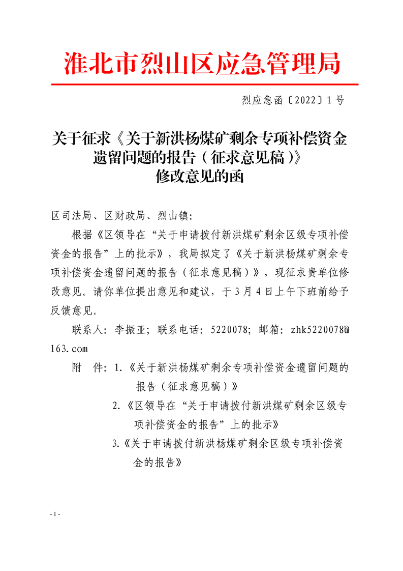 关于征求《关于新洪杨煤矿剩余专项补偿资金遗留问题的报告(征求意见稿)》修改意见的函