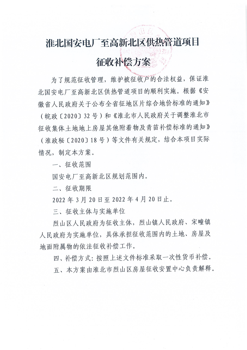 淮北国安电厂至高新北区供热管道项目征收补偿方案