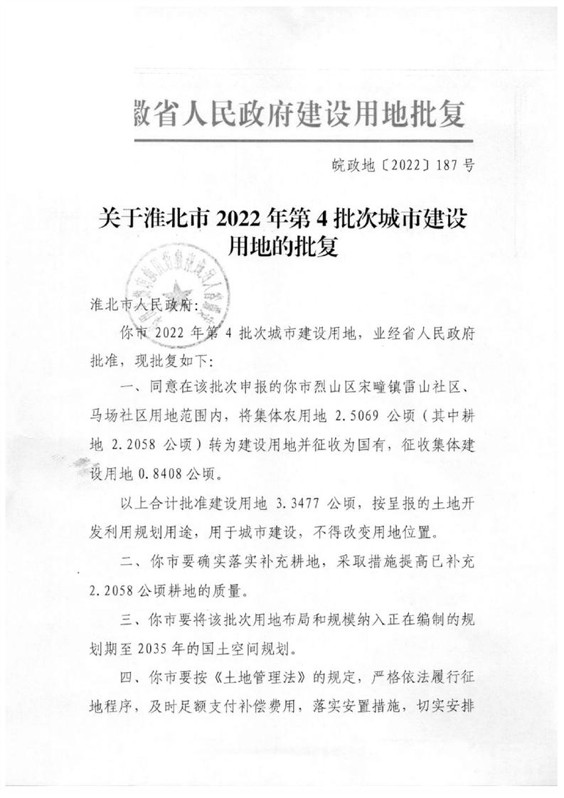 关于淮北市2022年第4批次城市建设用地的批复