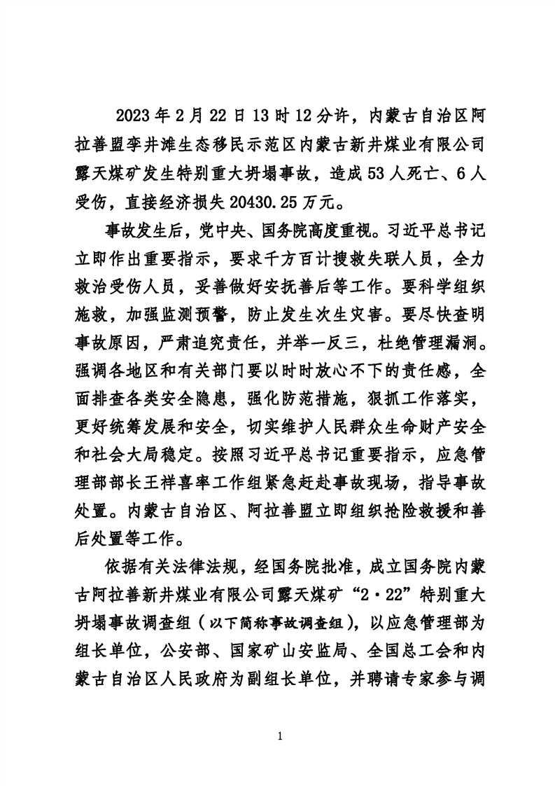 【典型安全生产事故通报】内蒙古阿拉善新井煤业有限公司露天煤矿“2·22”特别重大坍塌事故调查报告