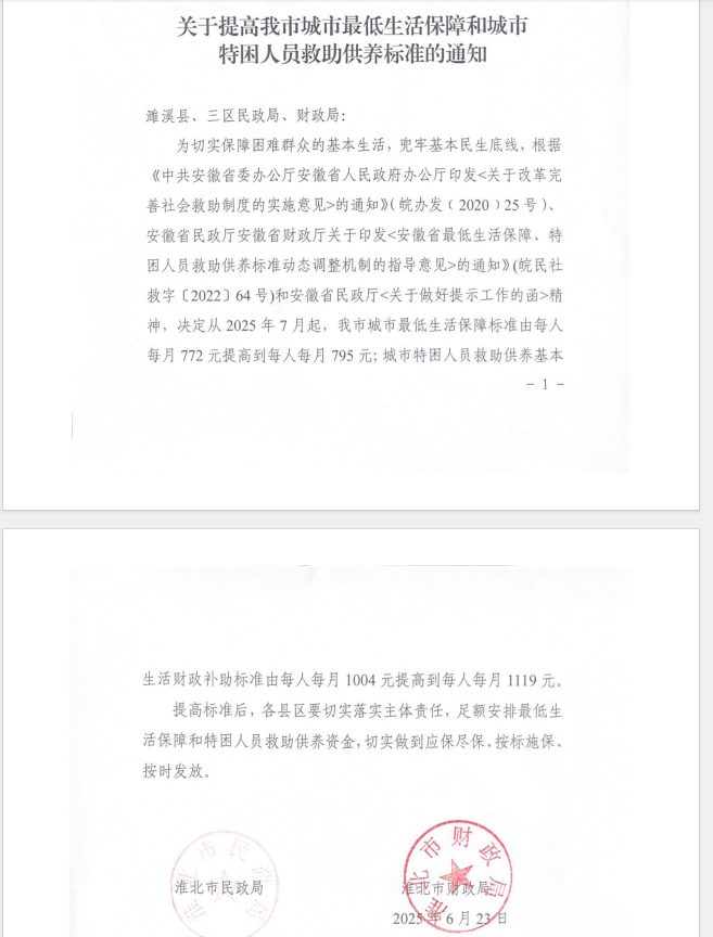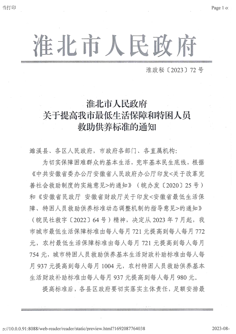 淮北市人民政府关于提高我市最低生活保障和特困人员救助供养标准的通知