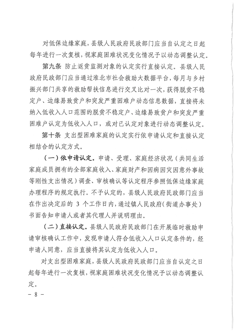 第九条 防止返贫监测对象的认定实行直接认定。县级人民 政府民政部门应当通过淮北市社会救助大数据平台,每月与乡村 振兴部门共享的救助帮扶信息进行交叉比对一次,获得脱贫不稳 定户、边缘易致贫户和突发严重困难户动态信息数据,直接将未 纳入低收入人口范围的脱贫不稳定户、边缘易致贫户和突发严重 困难户认定为低收入人口,或对已认定对象进行动态调整认定。
