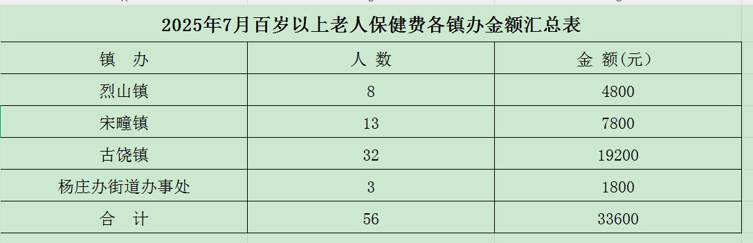 2025年7月百岁以上老人保健费汇总表