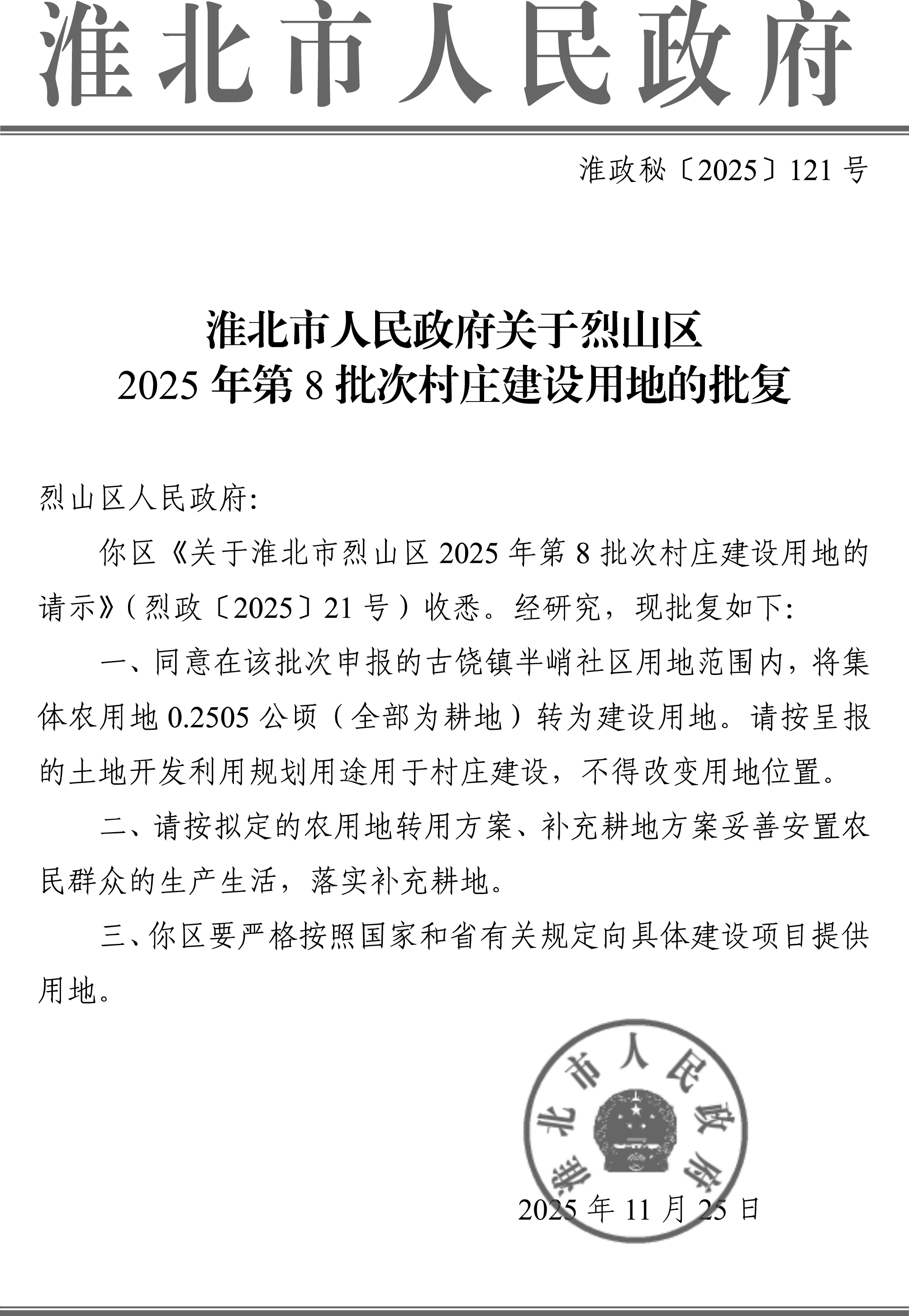 淮北市人民政府关于烈山区2025年第8批次村庄建设用地的批复