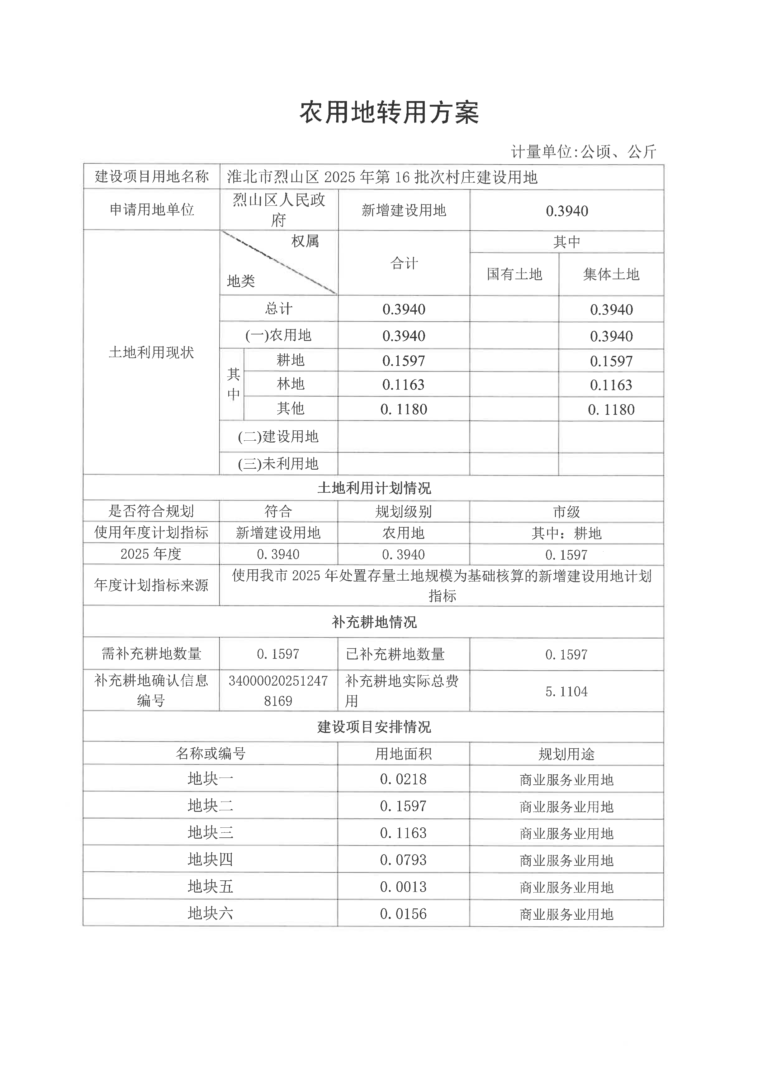 建设用地呈报农用地转用方案(烈山区2025年第16批次村庄建设用地)