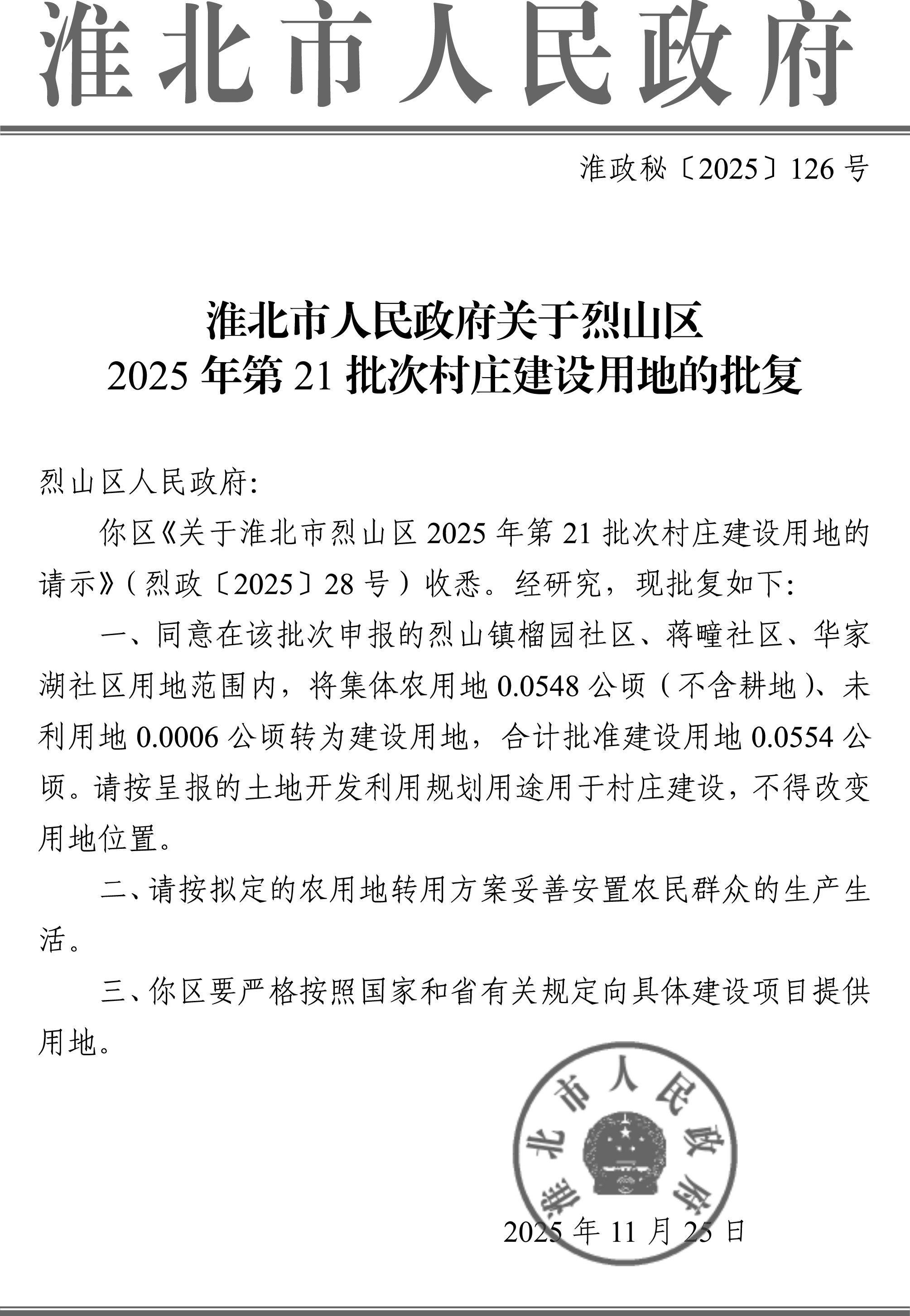 淮北市人民政府关于烈山区2025年第21批次村庄建设用地的批复