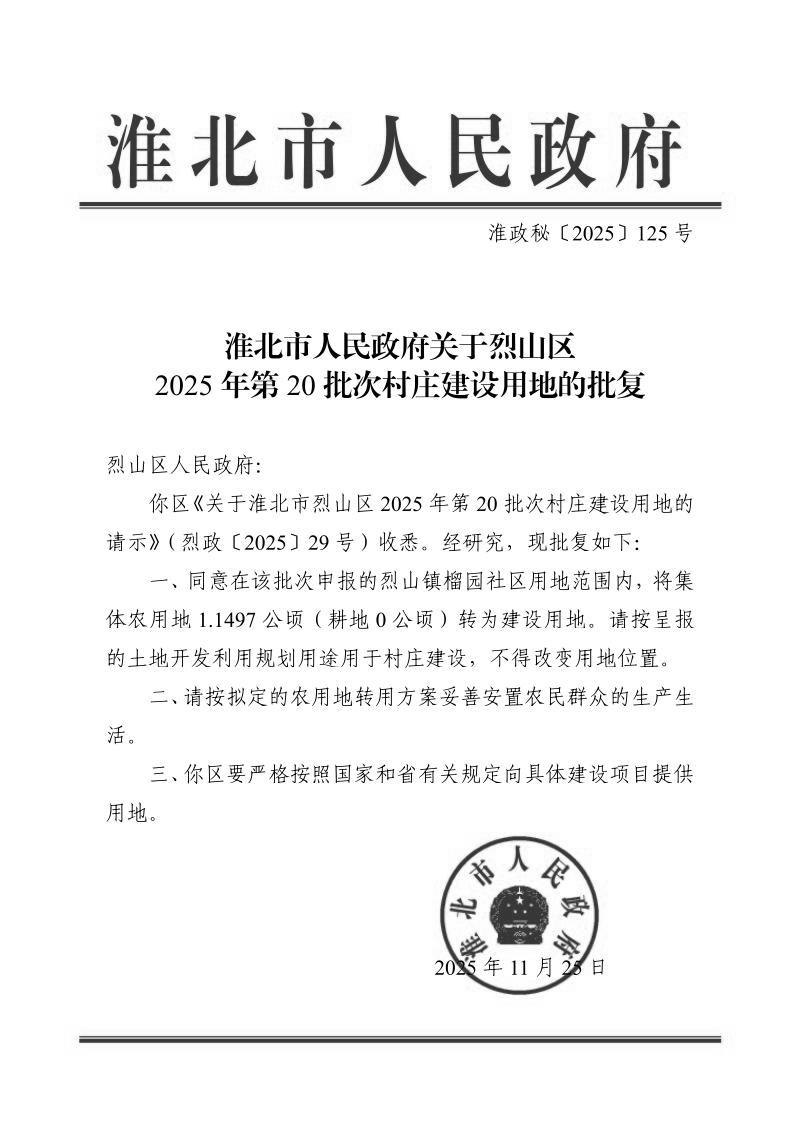 淮北市人民政府关于烈山区2025年第20批次村庄建设用地的批复