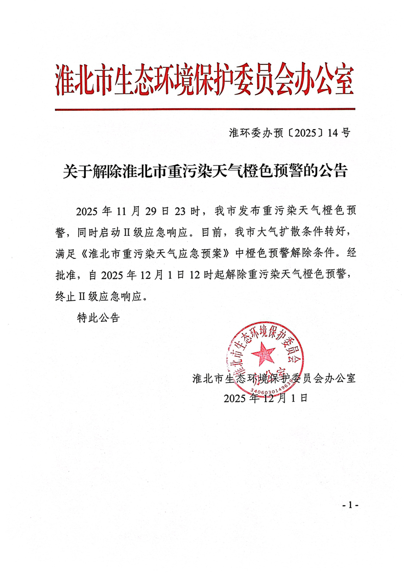 淮环委办预〔2025〕14号关于解除重污染天气橙色预警的公告