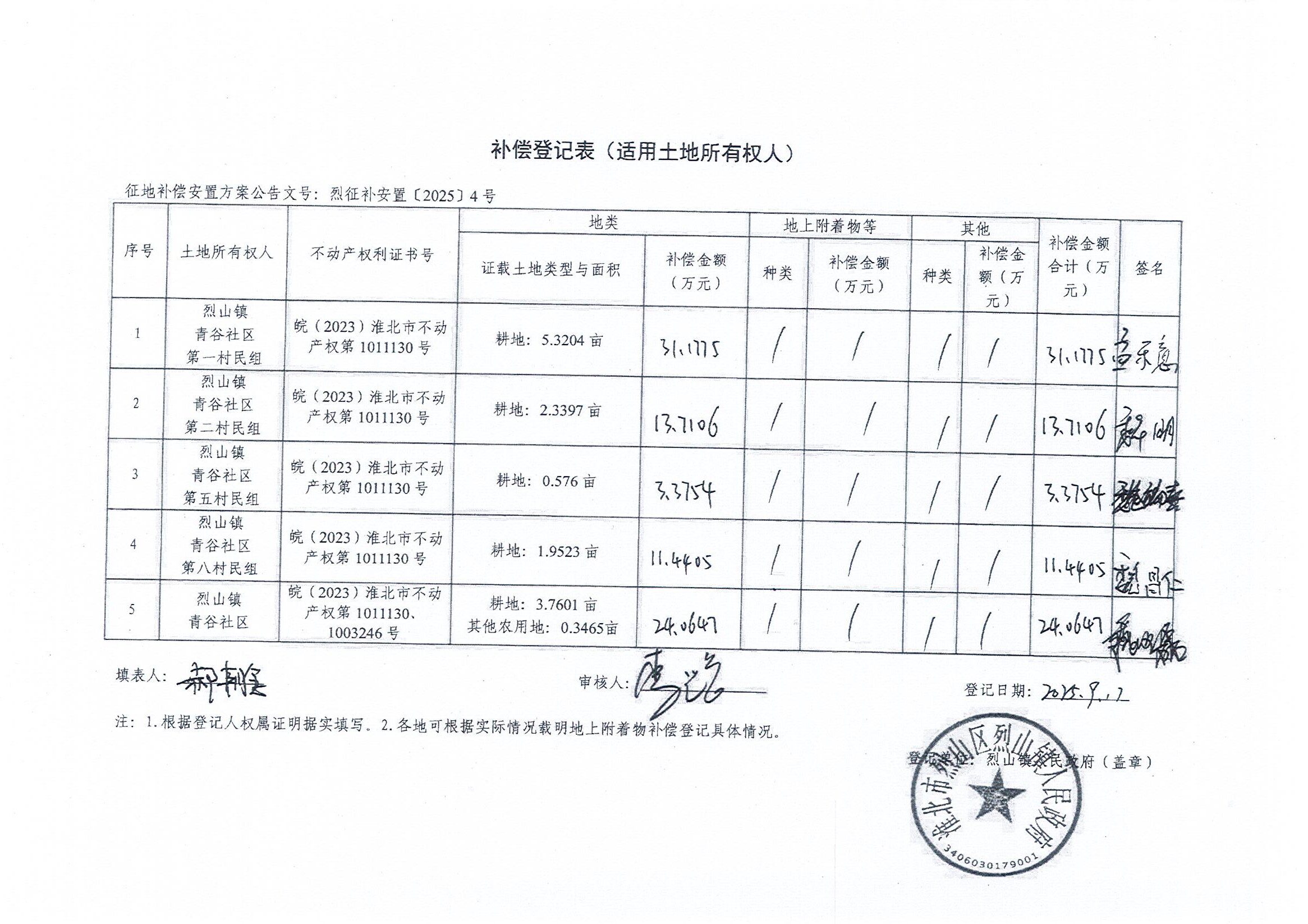 补偿登记表(淮北市烈山区2025年第1批次城镇建设用地)