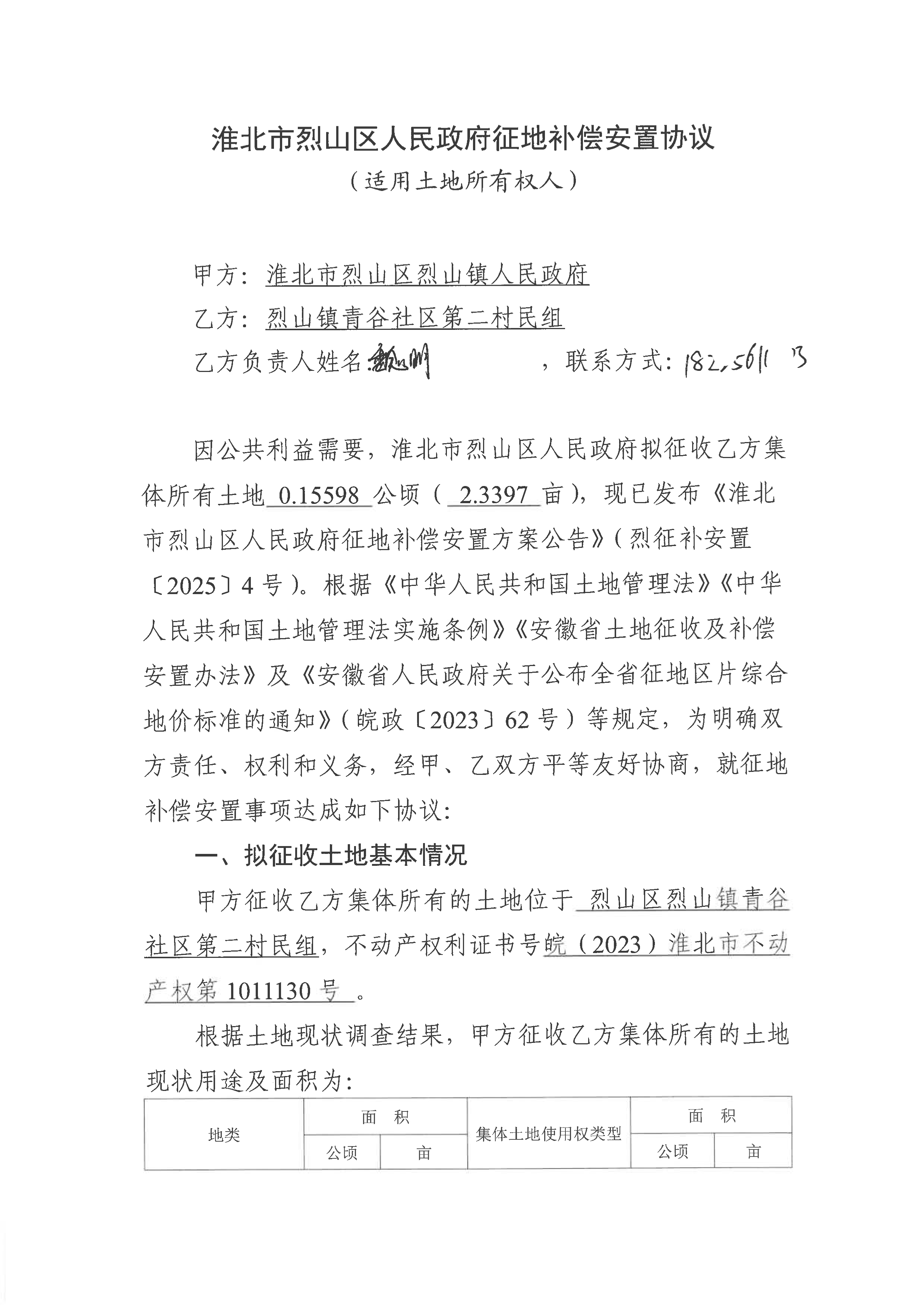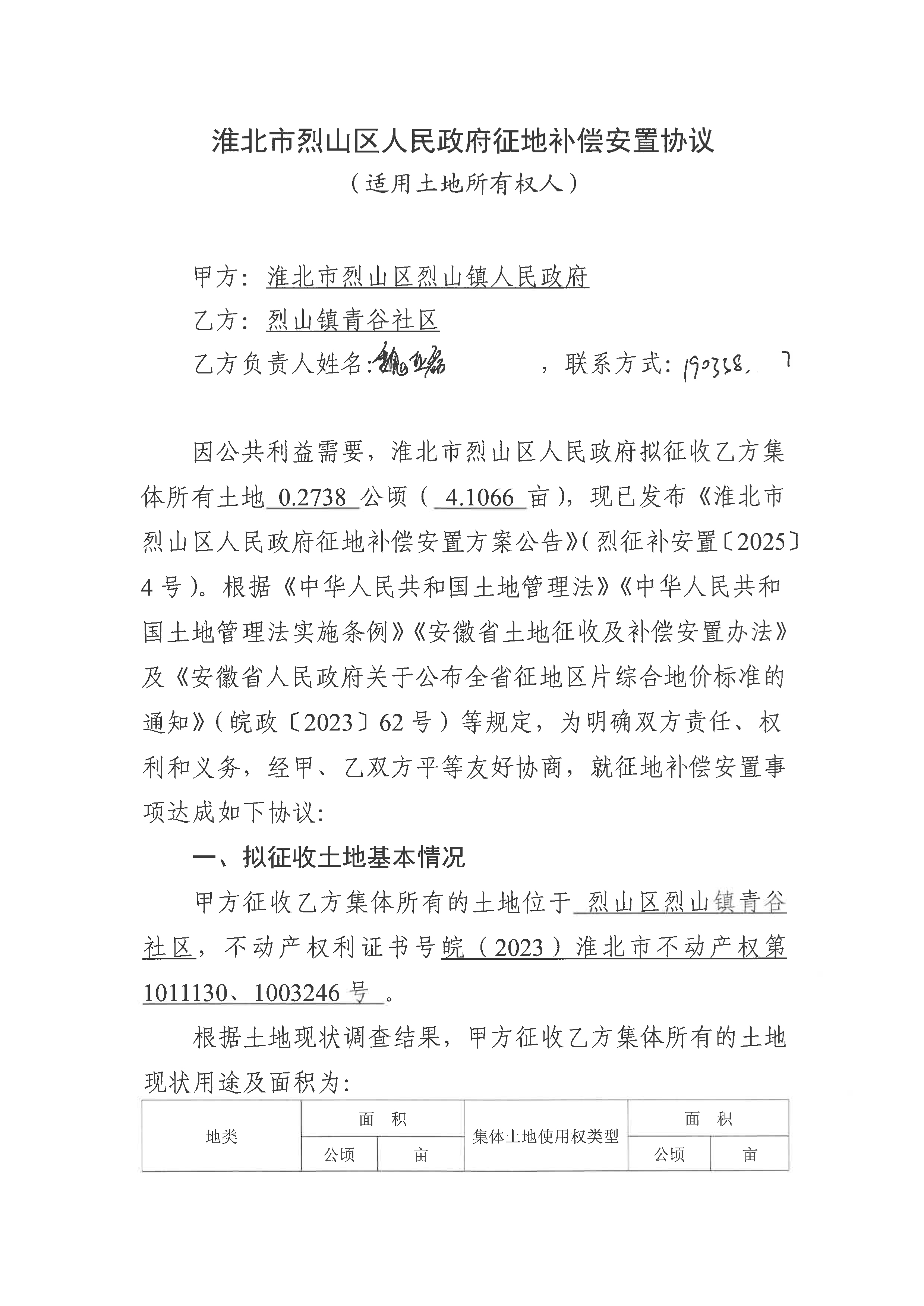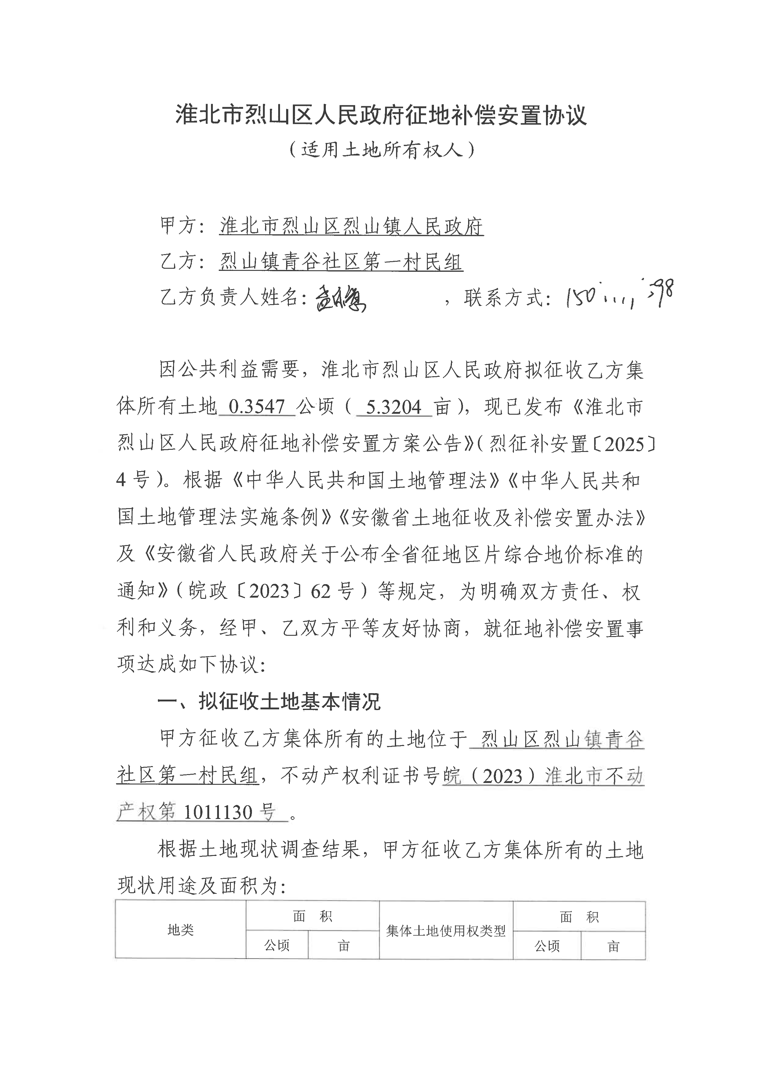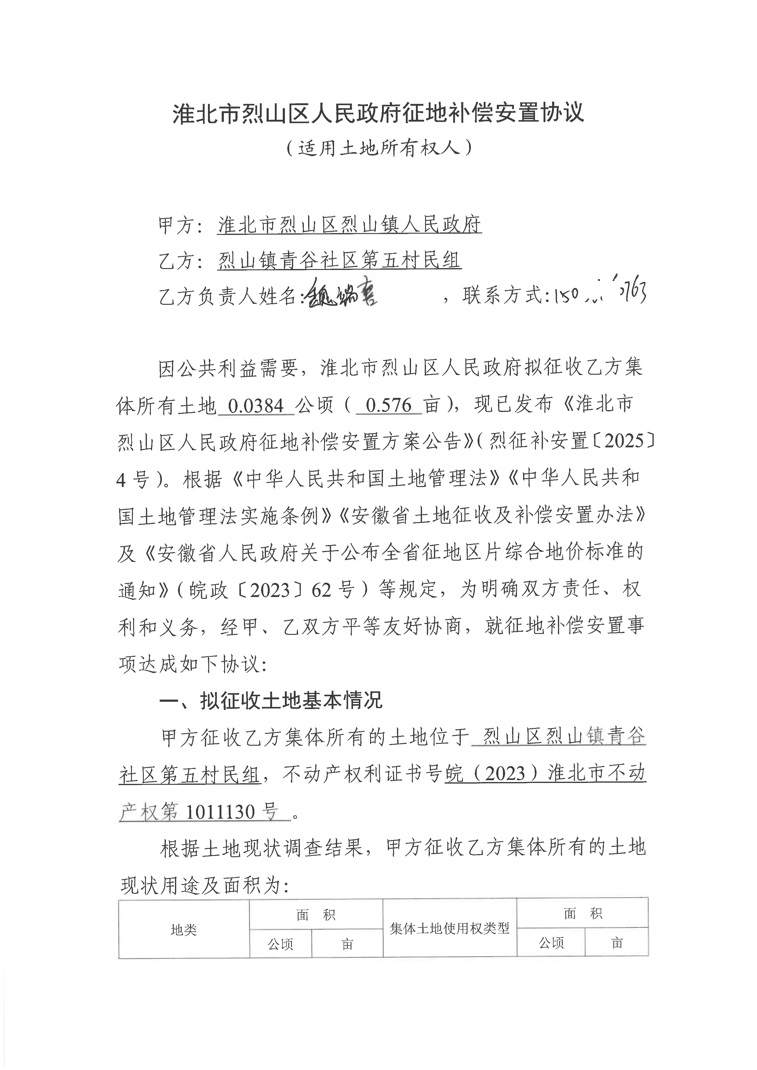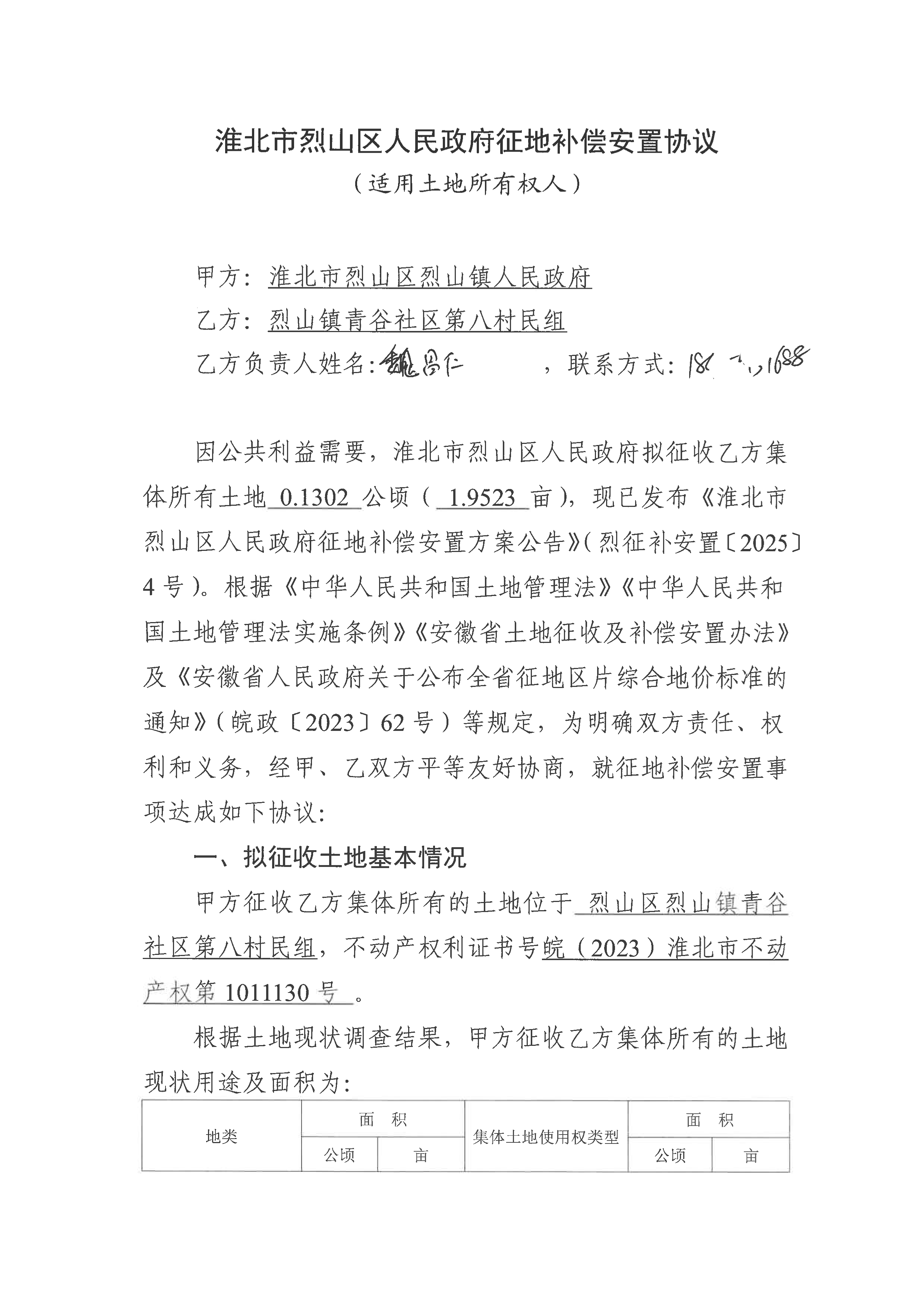 淮北市烈山区人民政府征地补偿安置协议(烈山区2025年第1批次城镇建设用地)