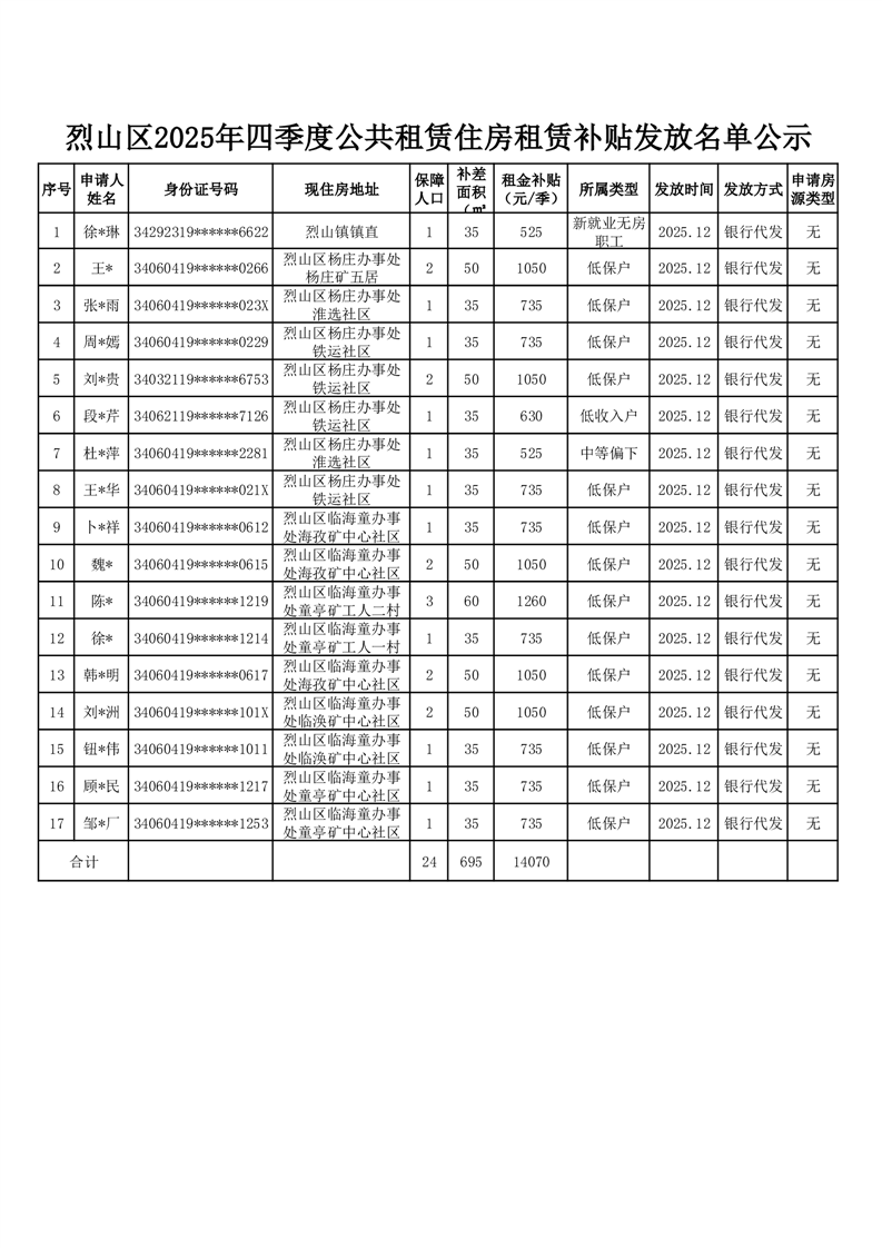 烈山区2025年第四季度廉租房租赁补贴发放名单公示
