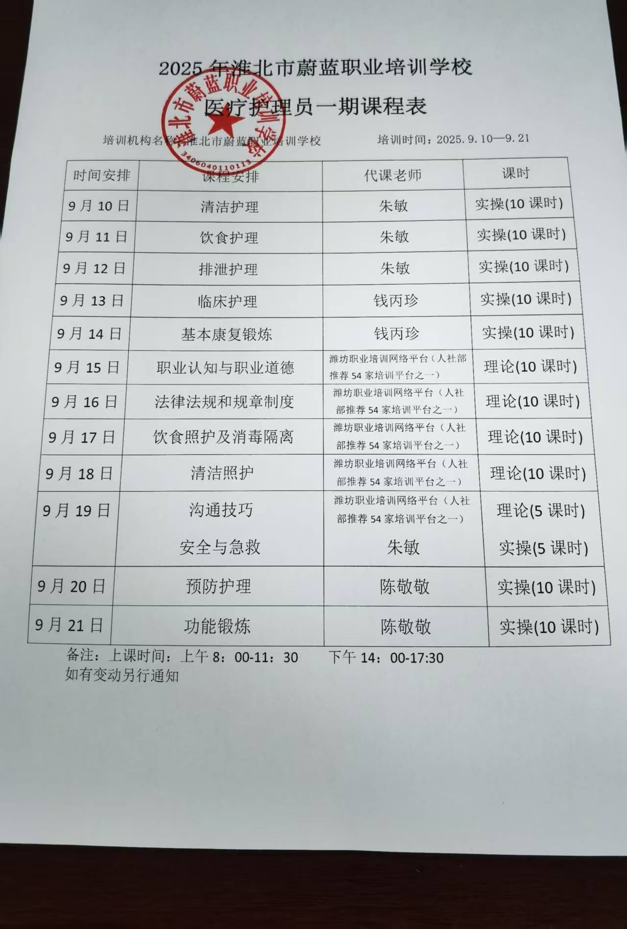 淮北市蔚蓝职业培训学校“2025年度医疗护理员一期”经我局审核后同意开班。培训时间从2025年9月10日至9月21日,培训地点:烈山镇青谷社区,安徽职业培训信息管理系统平台(https://zypx.ahrs.org.cn:9001/ahzypx/login),培训工种:医疗护理员。