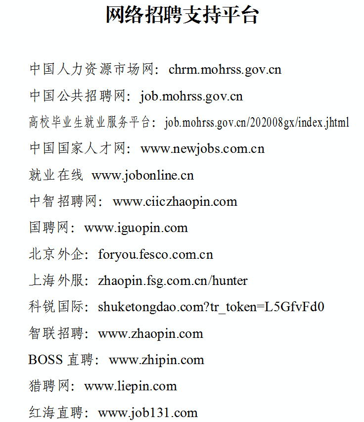 (二)集中开展大规模线上招聘。专项行动在中国人力资源市场网设立线上招聘主会场,在中国公共招聘网、高校毕业生就业服务平台、中国国家人才网、就业在线以及中智招聘、国聘等网络招聘平台(附件1)开设专区,集中发布、动态更新招聘信息。鼓励人力资源服务企业积极参与网络招聘活动,持续推出群体性、行业性、区域性线上专场招聘,并与专项行动主会场链接。