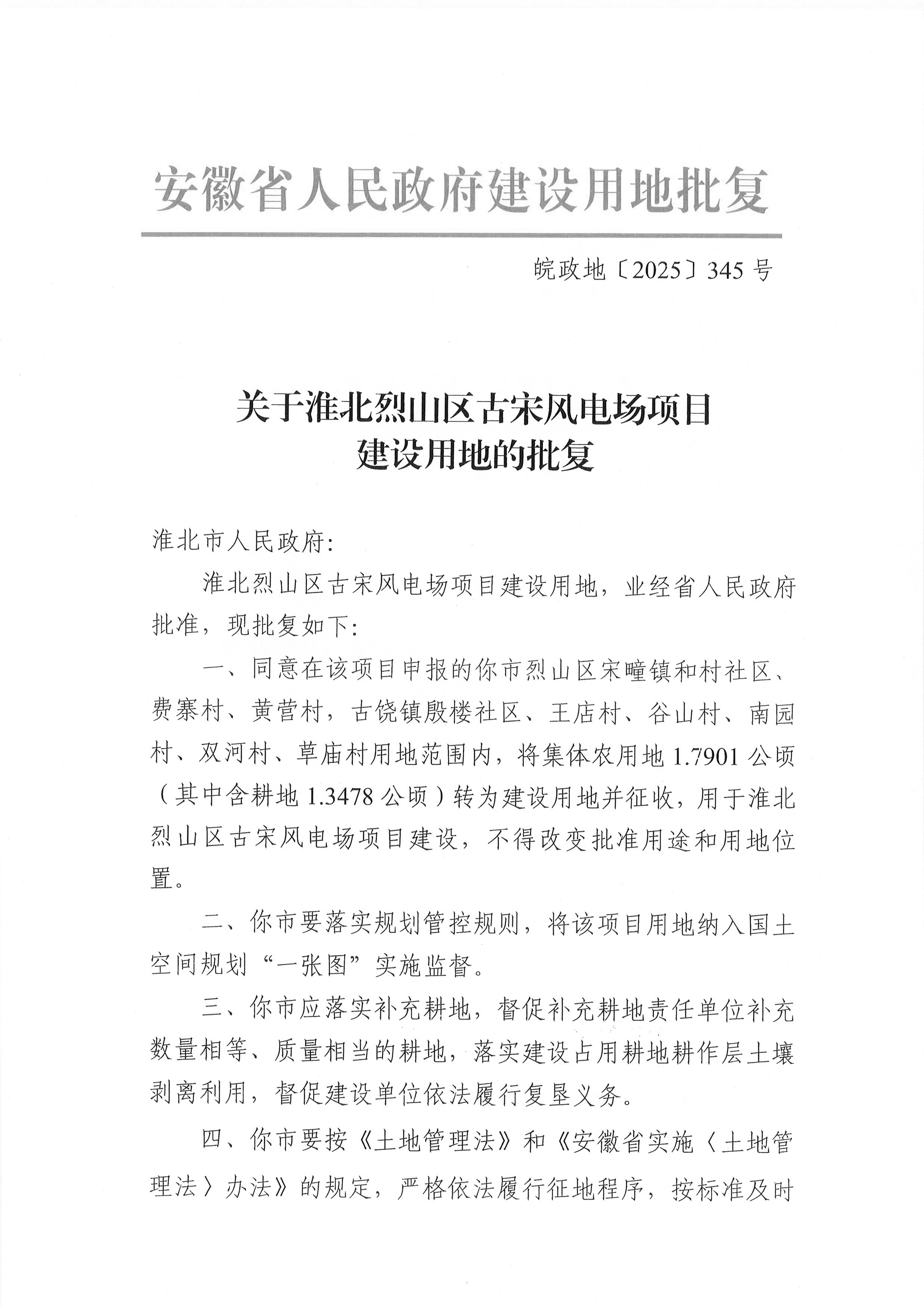 关于淮北烈山古宋风电场项目建设用地的批复