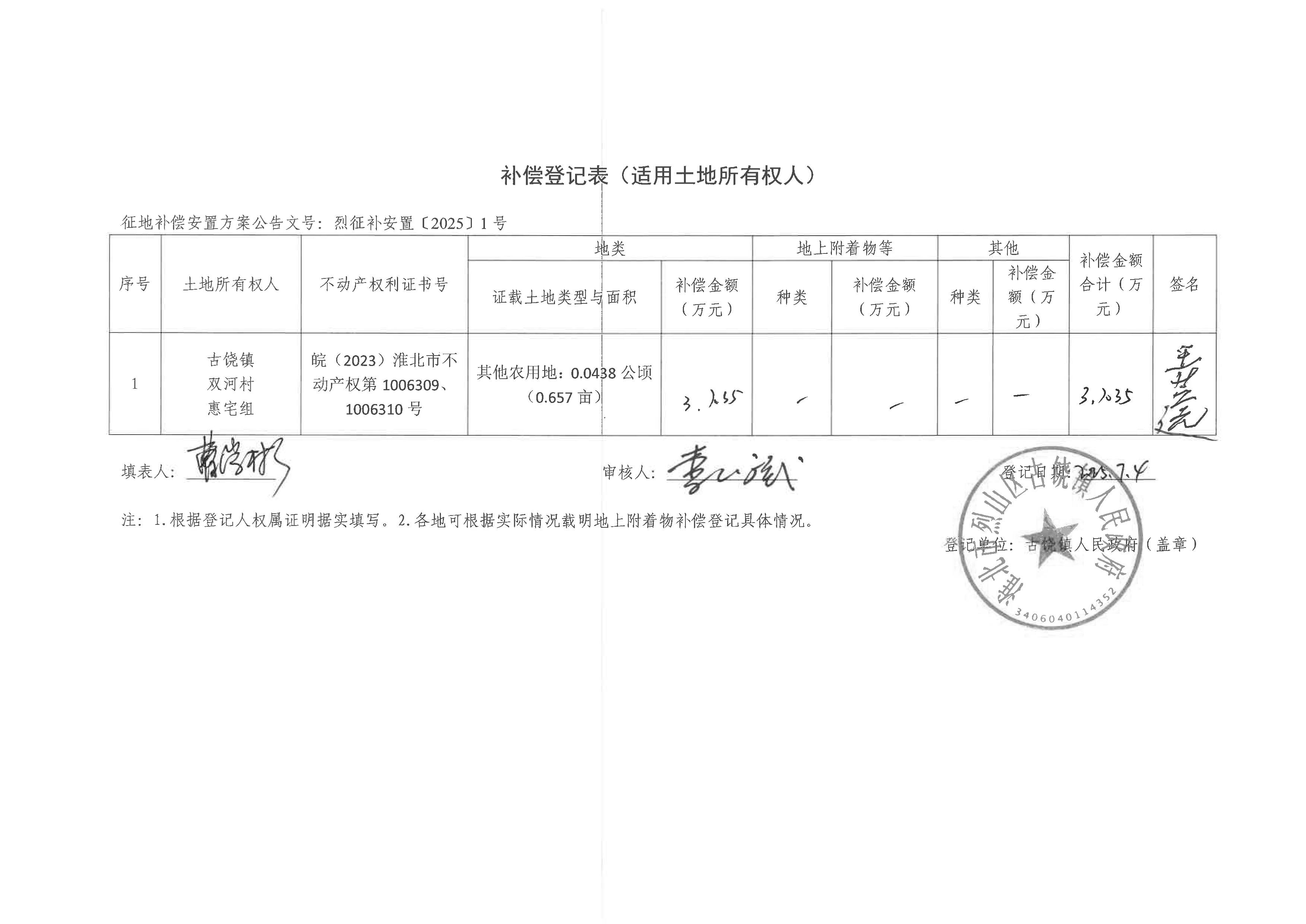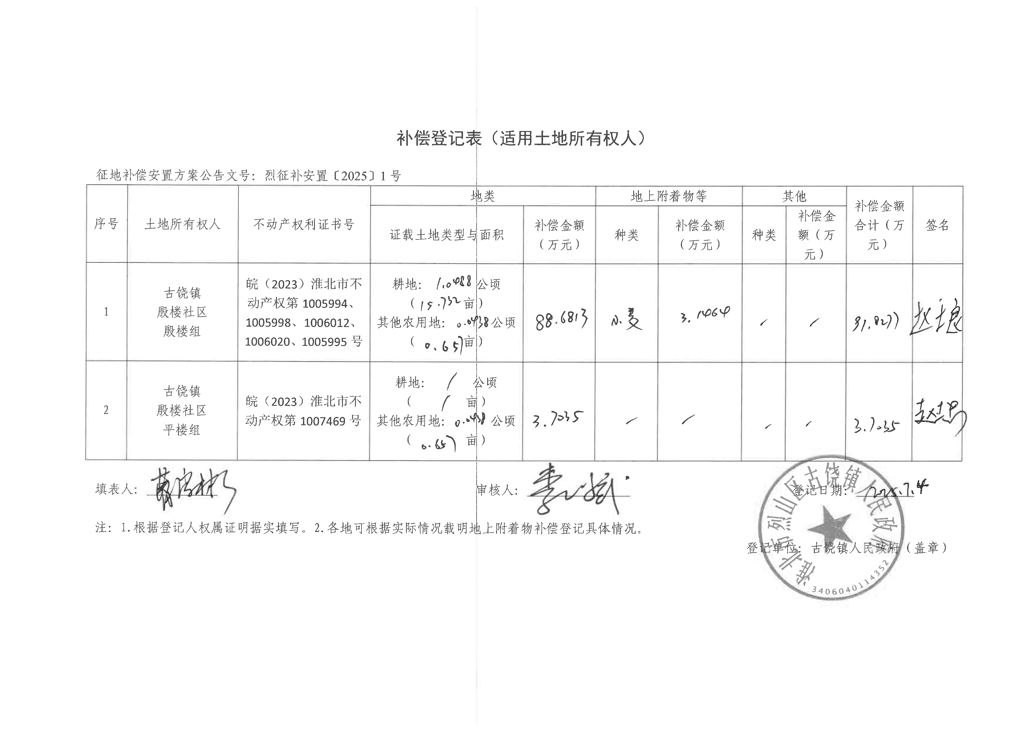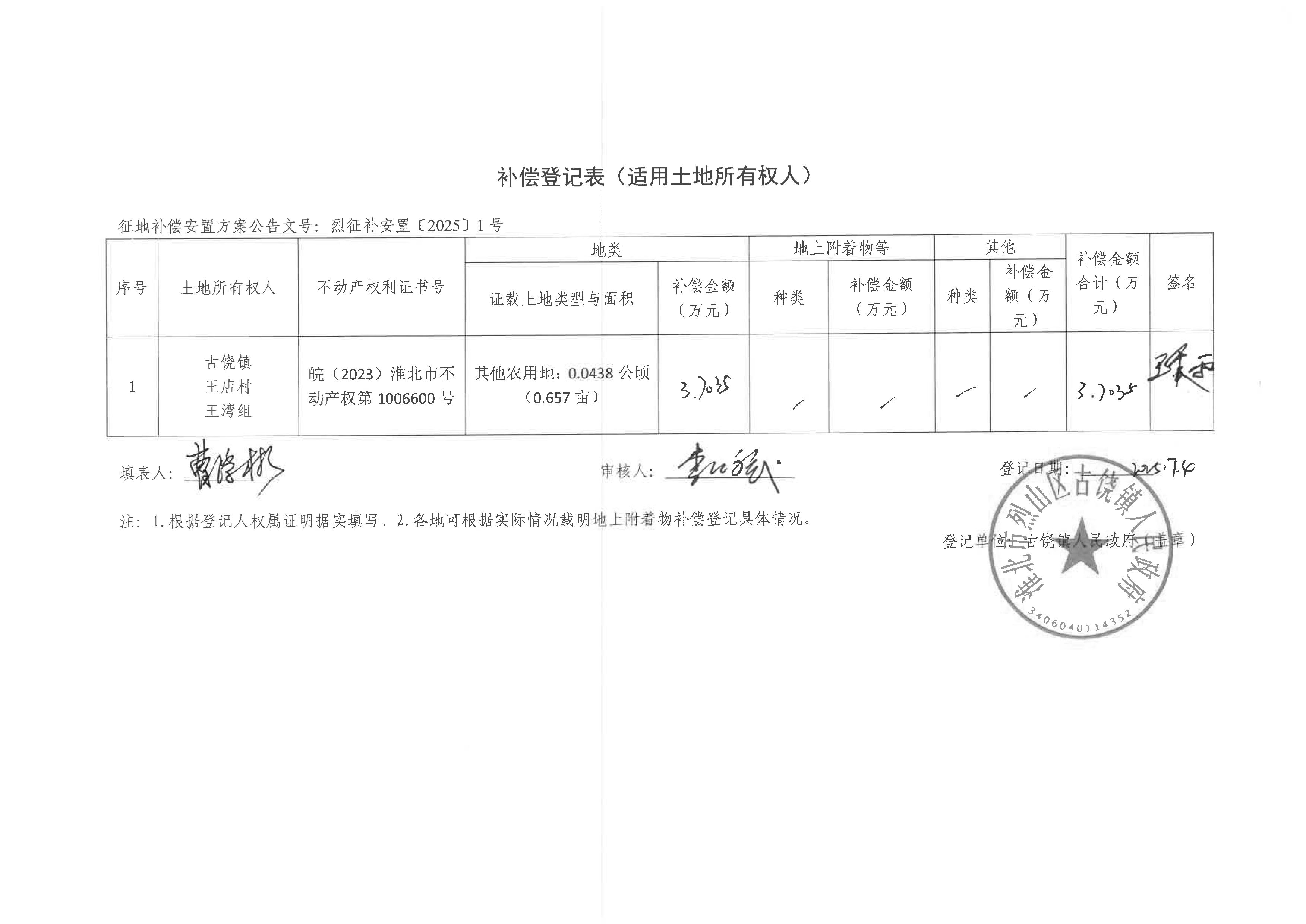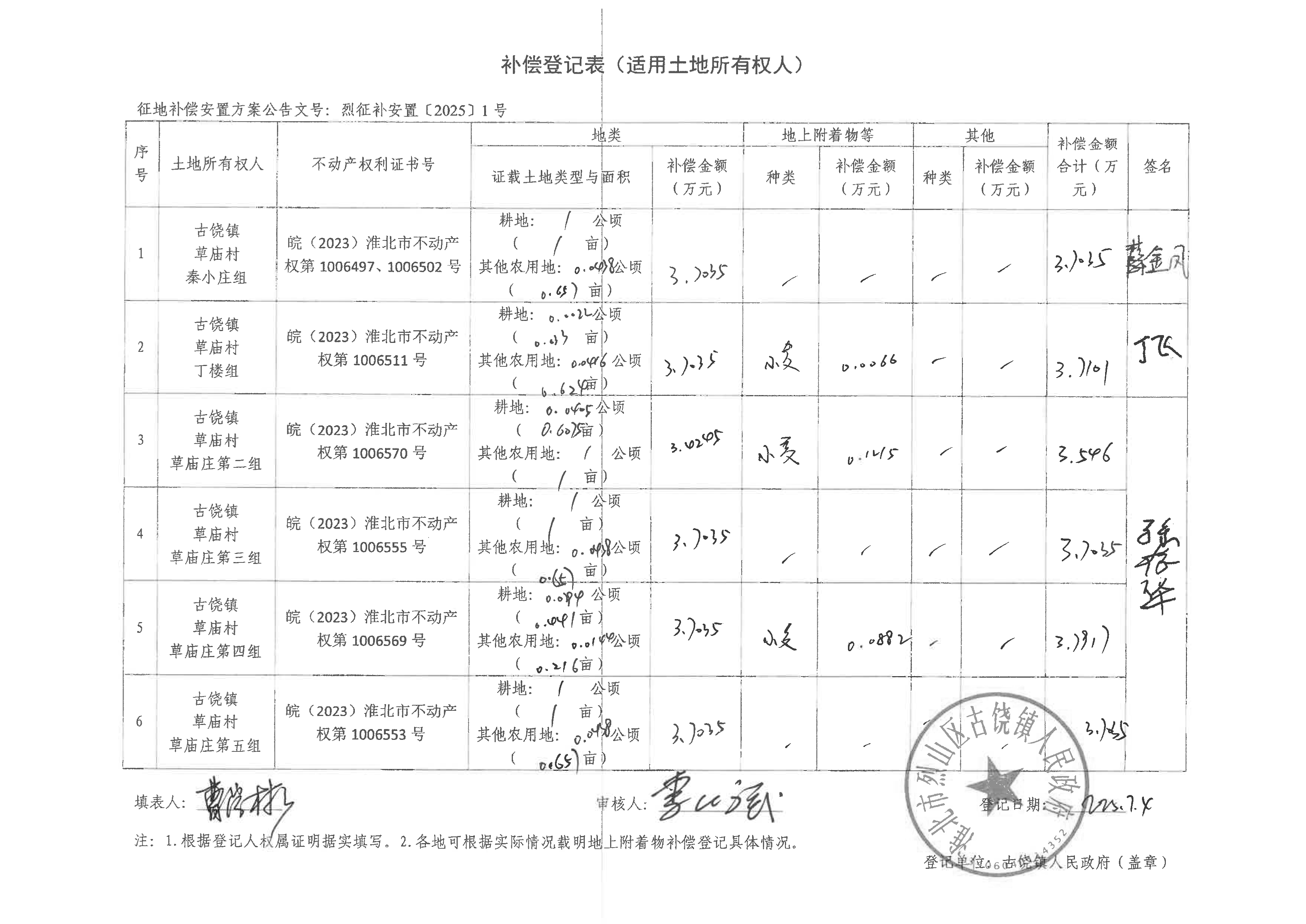 补偿登记表(淮北烈山区古宋风电场项目)