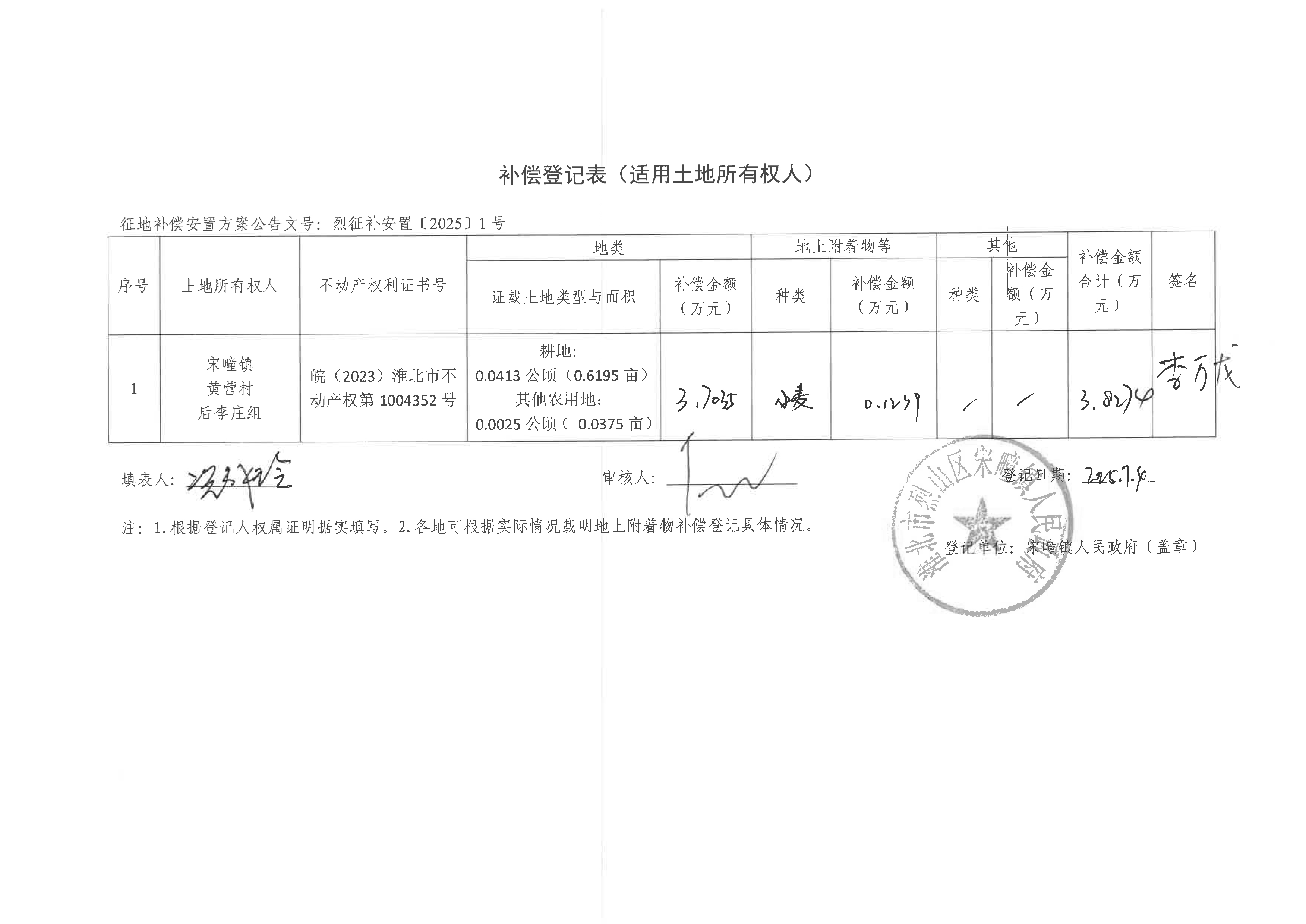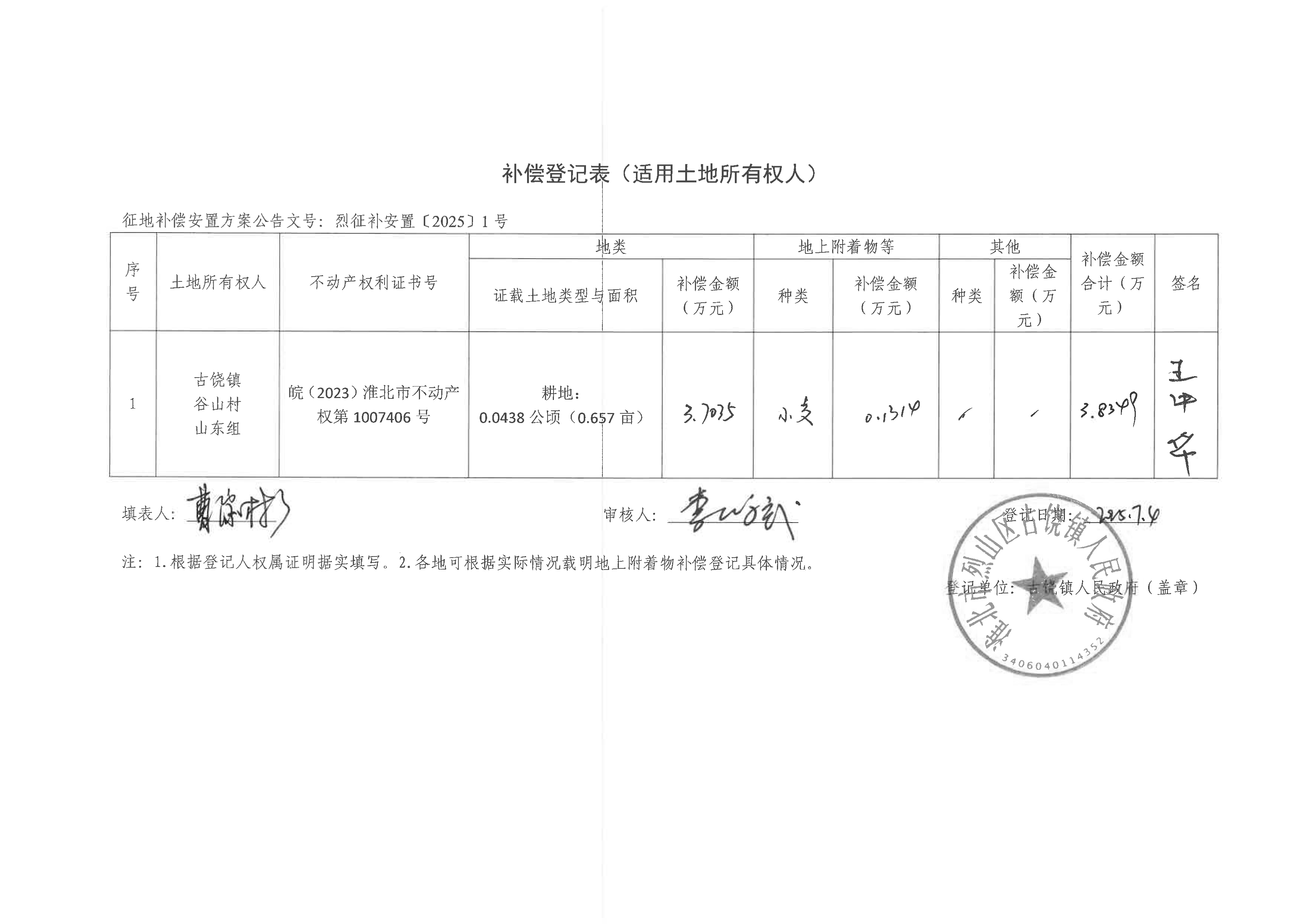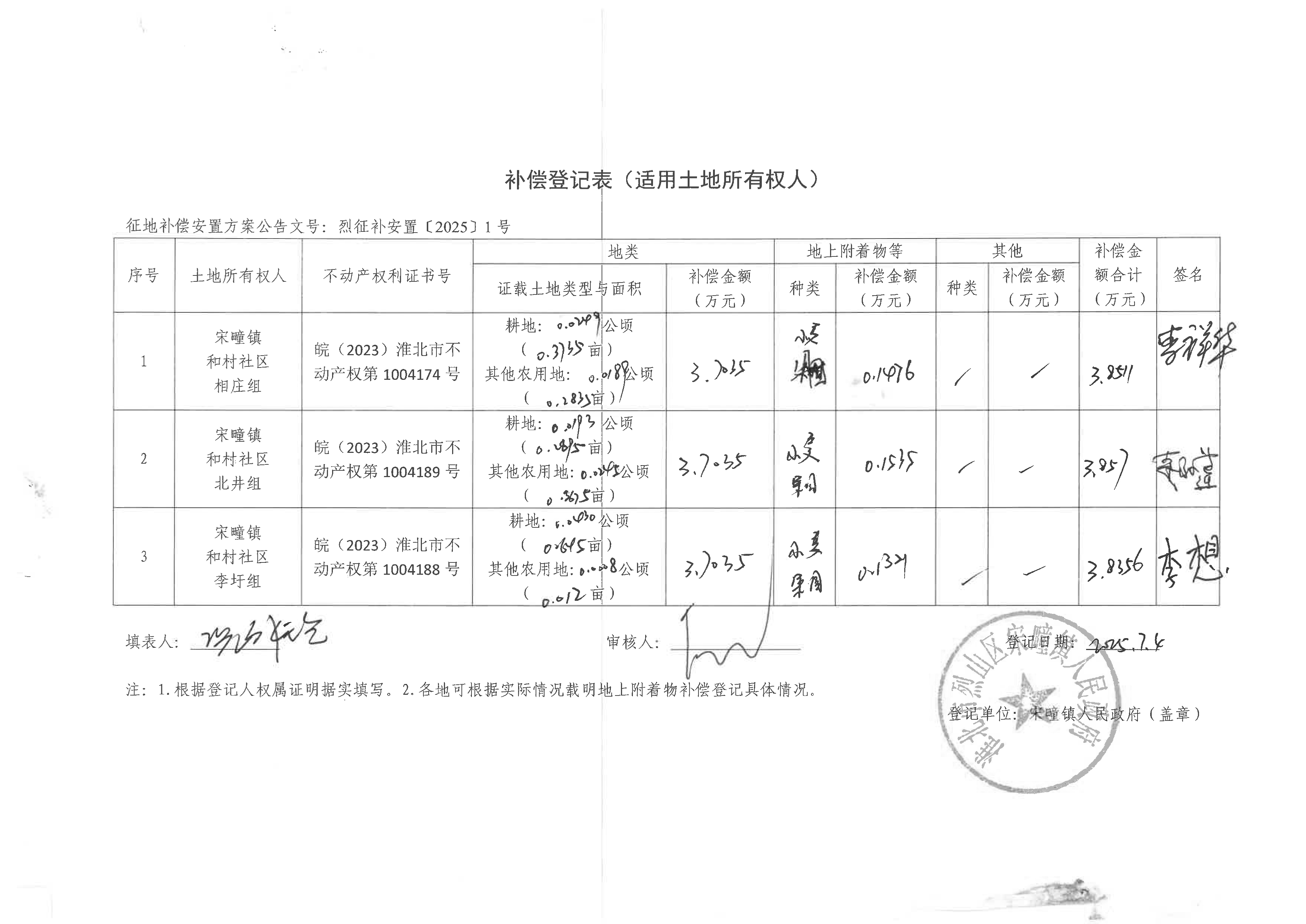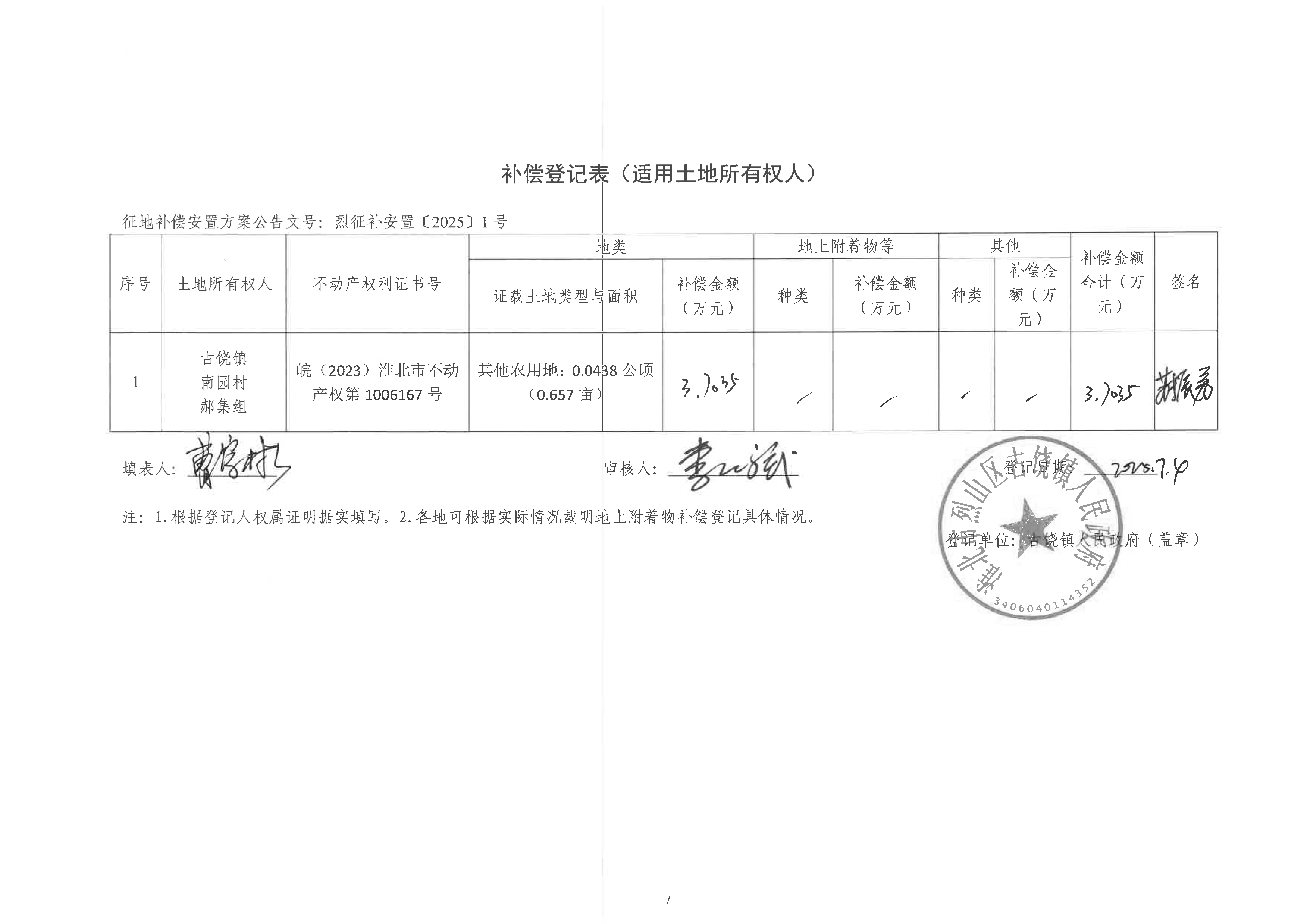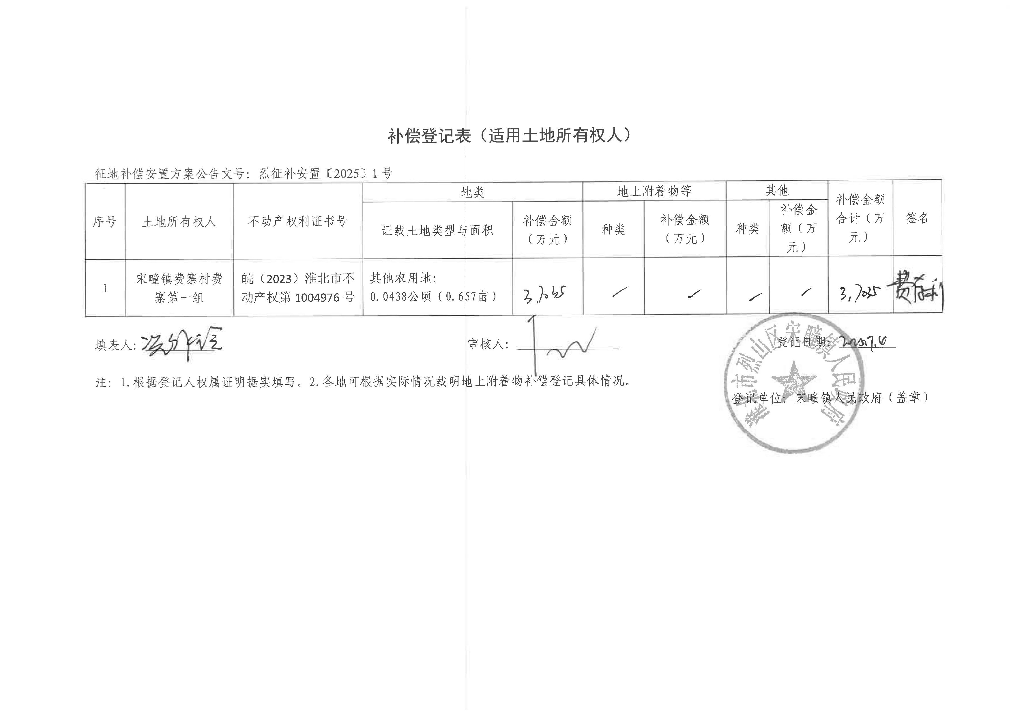 补偿登记表(淮北烈山区古宋风电场项目)