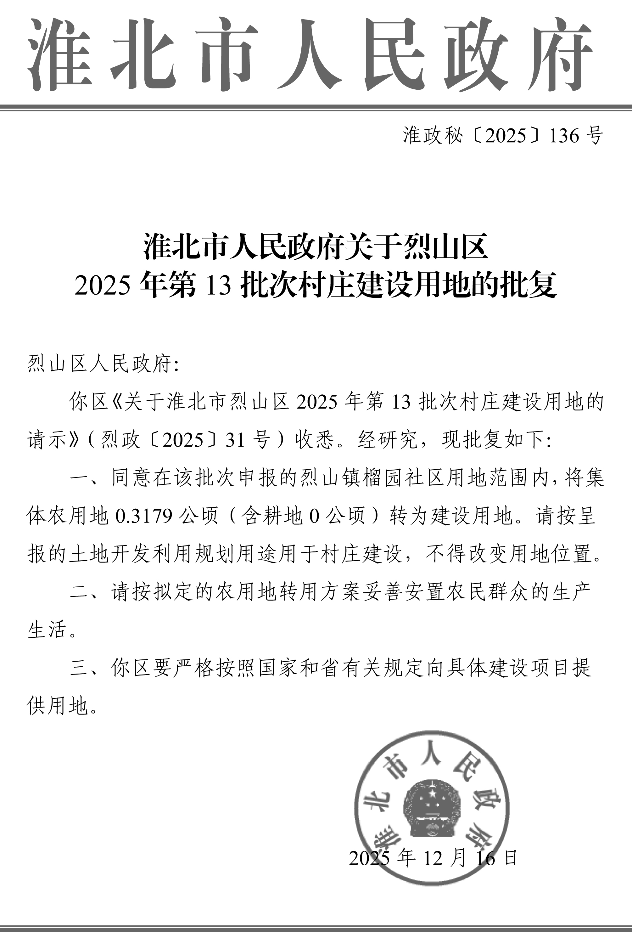淮北市人民政府关于烈山区2025年第13批次村庄建设用地的批复
