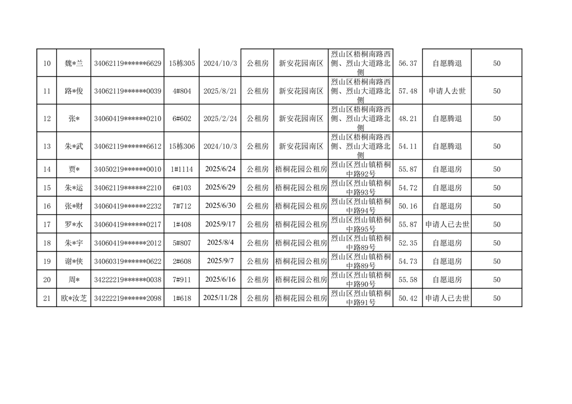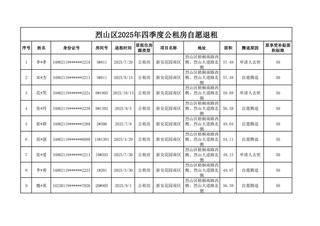 2025年烈山区公租房四季度自愿退出情况