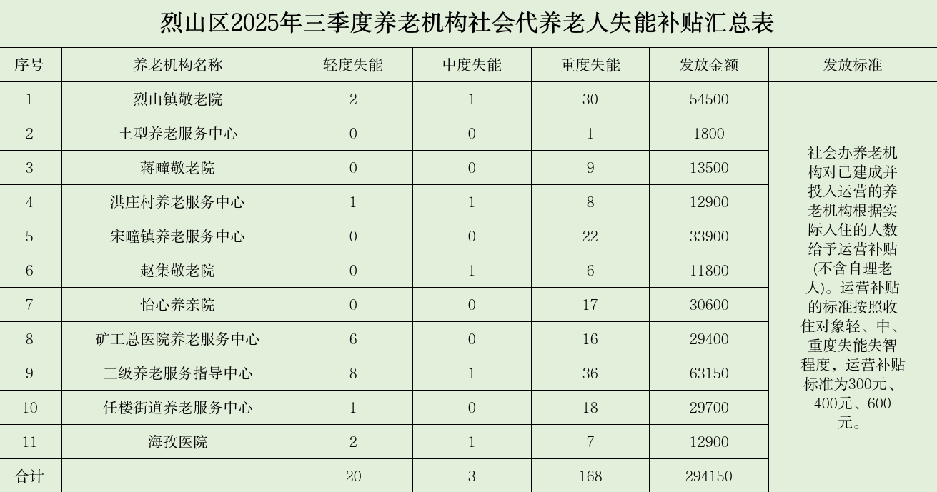 烈山区2025年三季度养老机构社会代养老人失能补贴汇总表