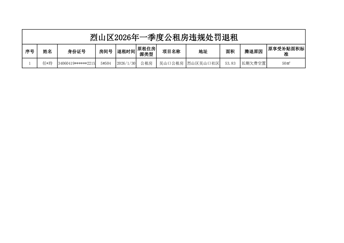 2026年烈山区公租房一季度违规处罚退出情况