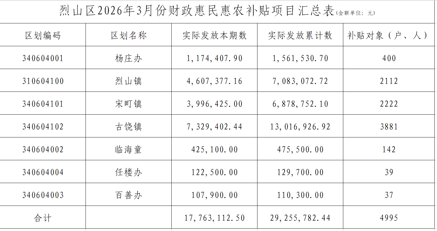 安徽省烈山区2026年3月份财政惠民惠农补贴资金月报表