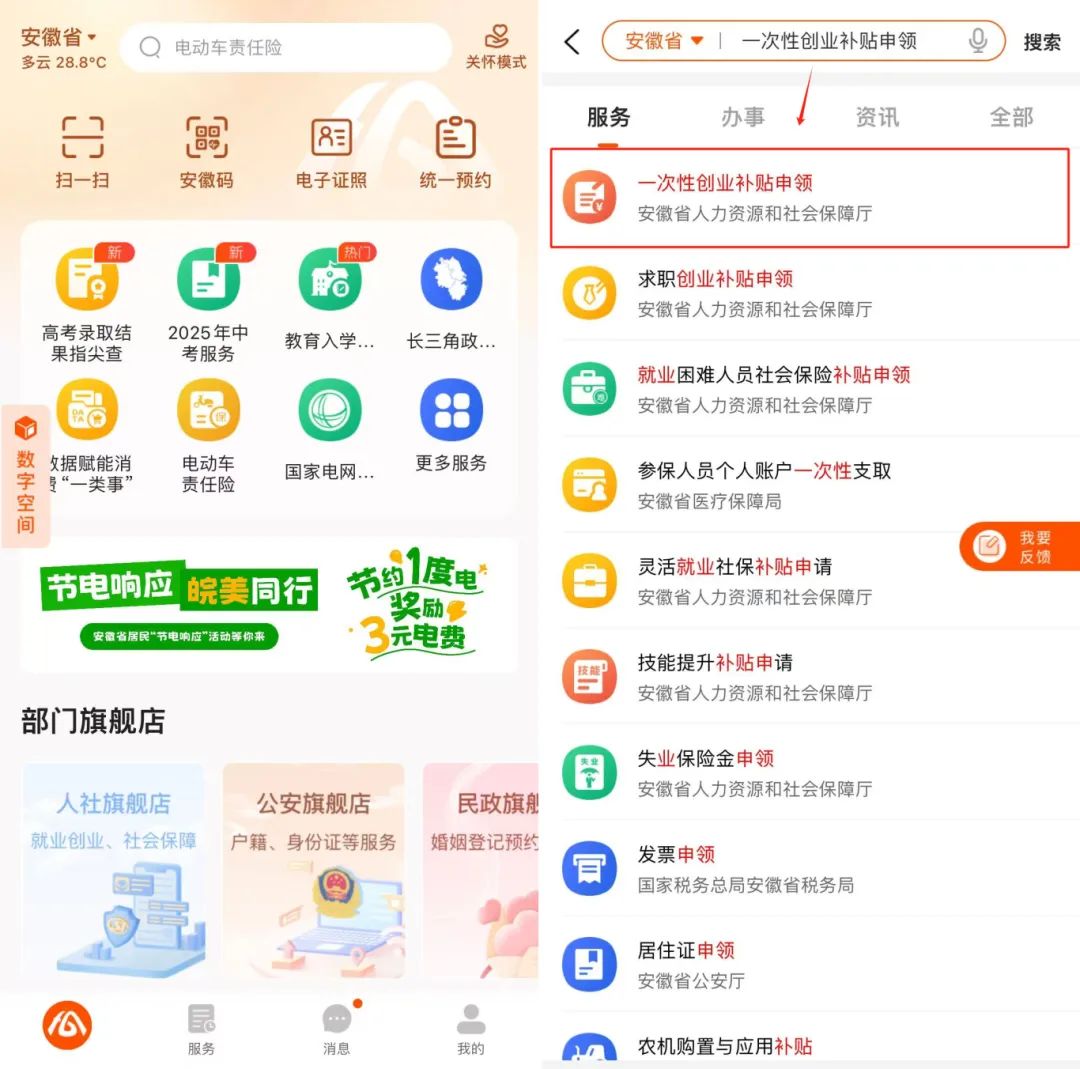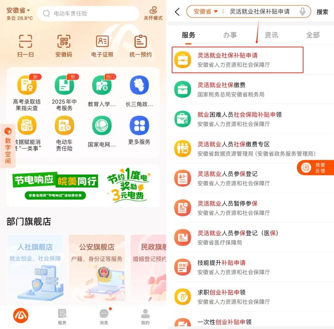 下载并注册登录“皖事通”APP,首页搜索“灵活就业社保补贴申请”,点击进入。