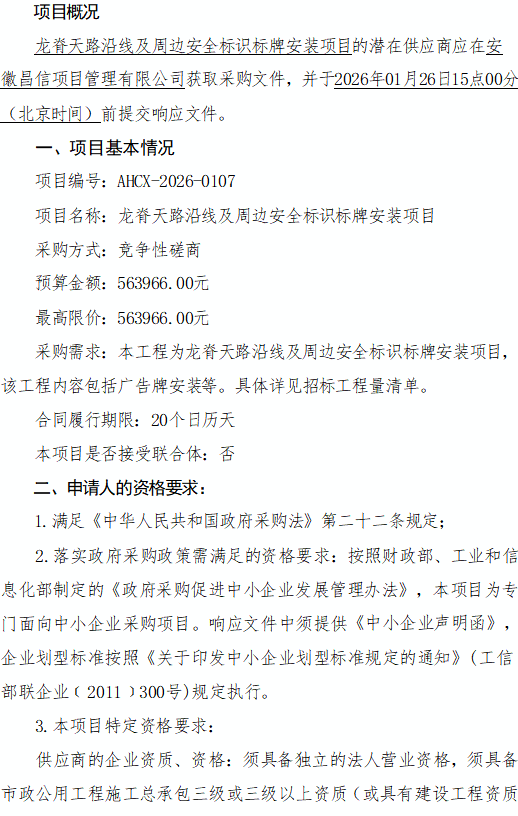 烈山区文化旅游体育局2026年第一季度招标公示——龙脊天路沿线及周边安全标识标牌安装项目竞争性磋商公告