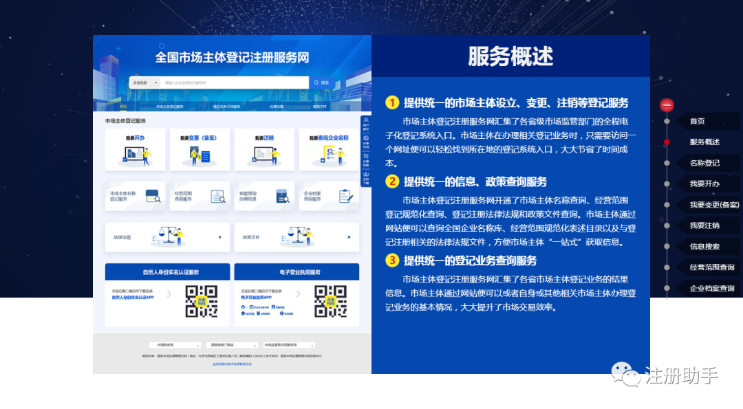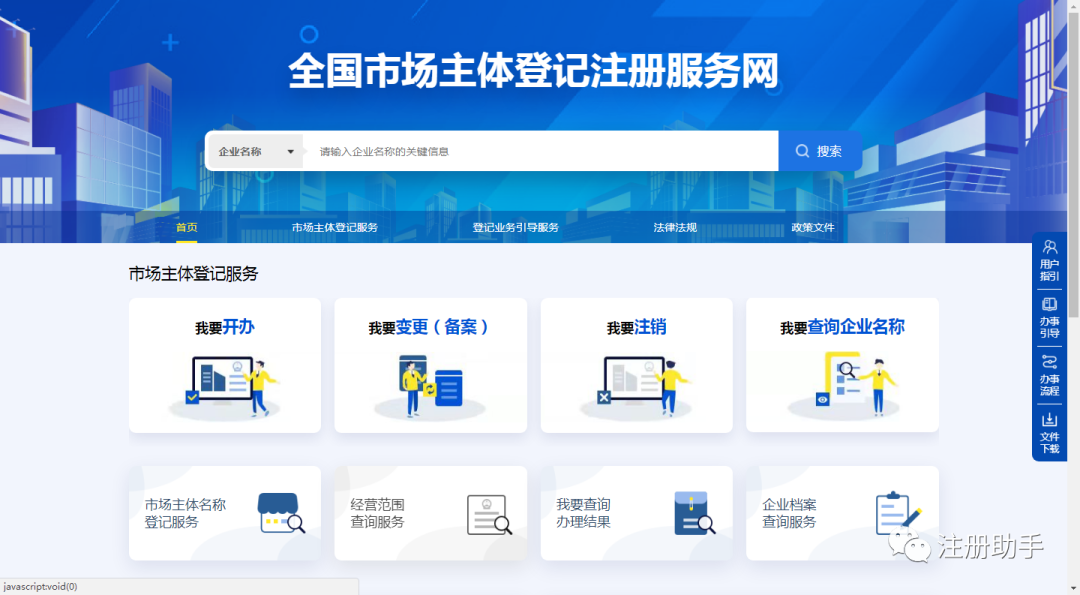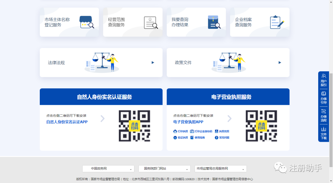 这是市场监管总局开发的“全国市场主体登记注册服务网”。这个网站里提供统一的市场主体设立、变更、注销等登记服务。不管你是哪个省市,在这里都能找到系统入口。从名称查询到经营范围规范化查询、从登记法律法规到详细的政策而文件,一个网站可以全部get到,这就是真·一站式获取信息了。samr=State Administration for Market Regulation=市场监管总局