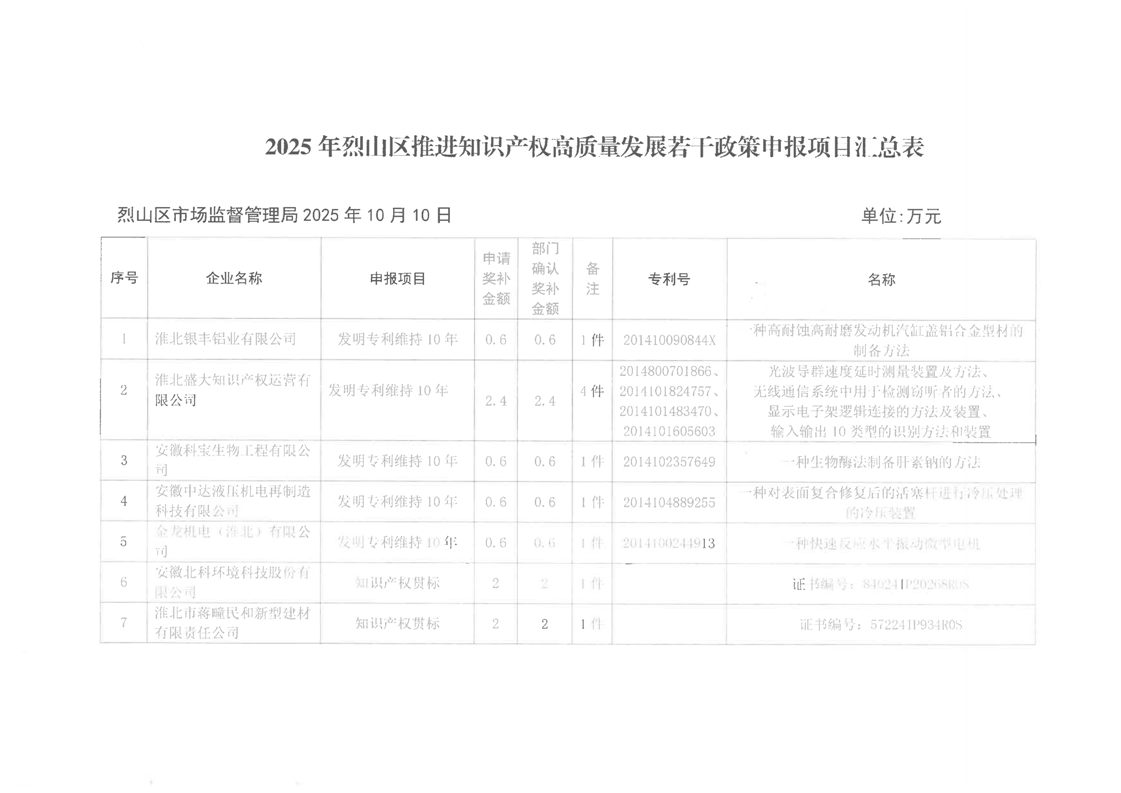 2025年烈山区推进知识产权高质量发展若干政策奖补通知