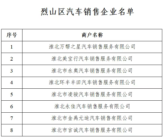 参与主体:在烈山区内注册登记并依法取得相关经营许可证件的汽车销售企业(具体名单附后,实行动态调整)。