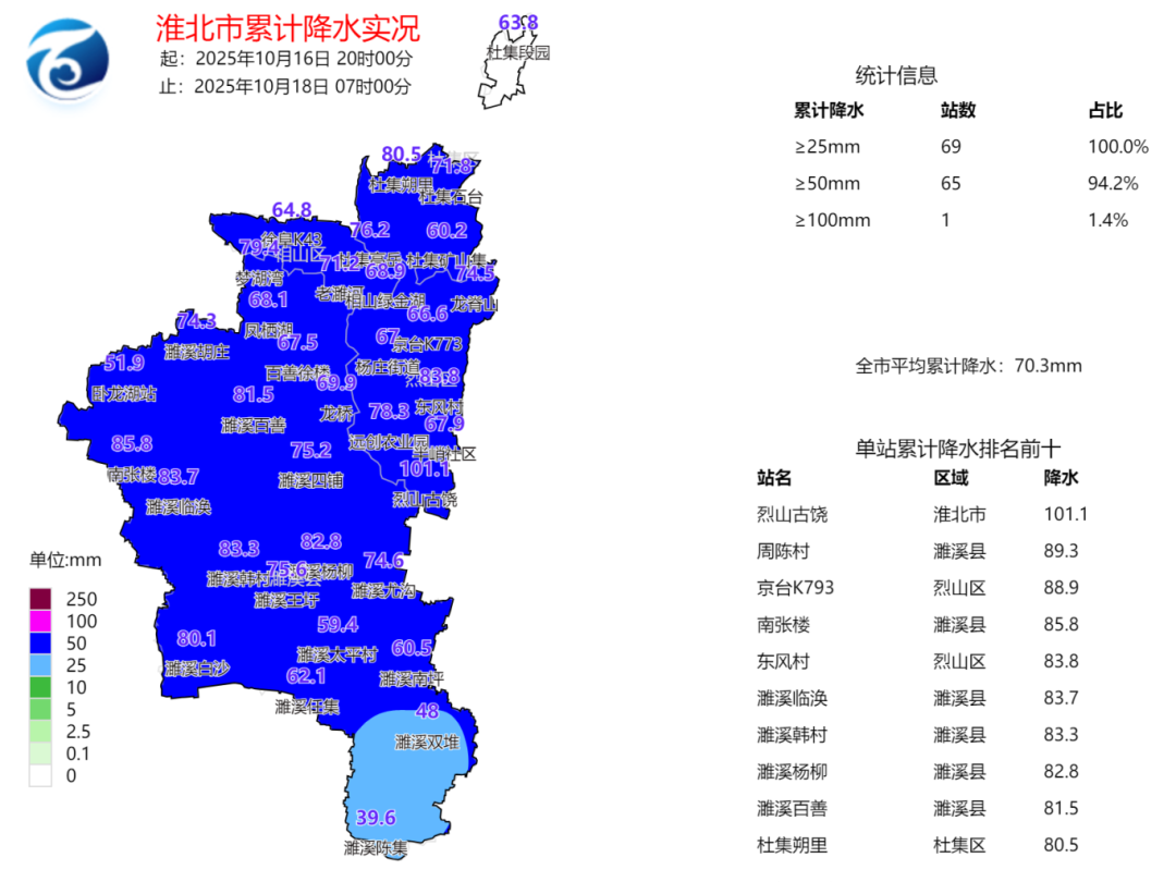 16日20时至18日7时,我市普降大到暴雨,雨量多在40~90毫米之间。全市平均雨量70.3毫米,其中相山区67.8毫米,杜集区65.1毫米,烈山区72.5毫米,濉溪县71.1毫米。淮北国家气象观测站64.8毫米,濉溪国家气象观测站67毫米。最大降水量101.1毫米,出现在烈山古饶。
